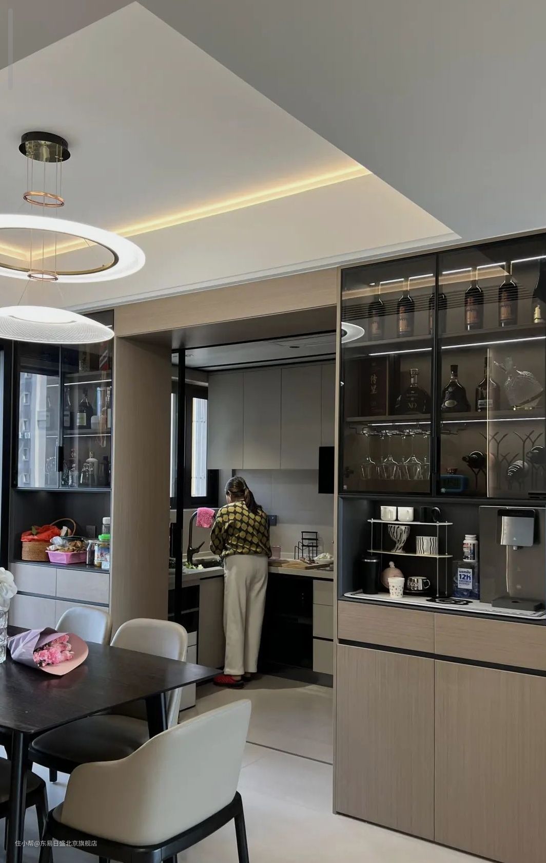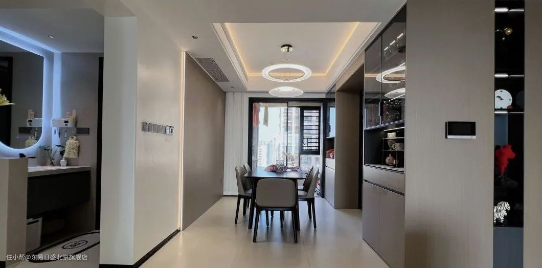 业主一家5口人,特别注重储物需求,陈先生精心挑选各种高要求的木制品,最终打造出一款集收纳、展示、美观于一体的餐边柜,功能齐全,利用率极佳。