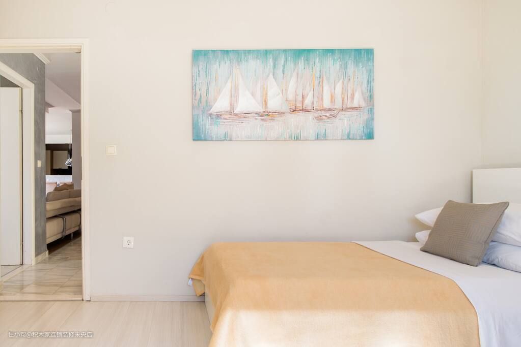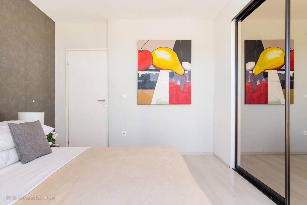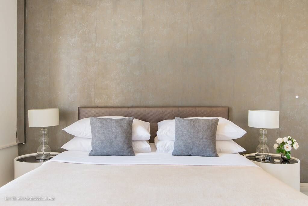 主卧床头背景墙采用了牛皮高档纸壁纸,不仅营造出一种深度和立体感,而且提升了主卧的格调感。床的采用以实木床架为主,质感较强,一来可以体现主人的品味,再者也表现了业主的生活态度和生活方式。卧室墙面和地面选择了素雅的米色,与床品的颜色相呼应。侧墙搭配抽象挂画,丰富整个休憩环境。