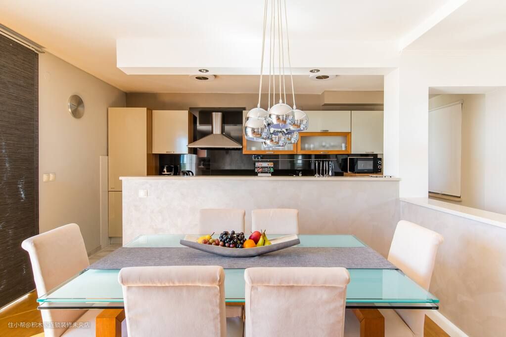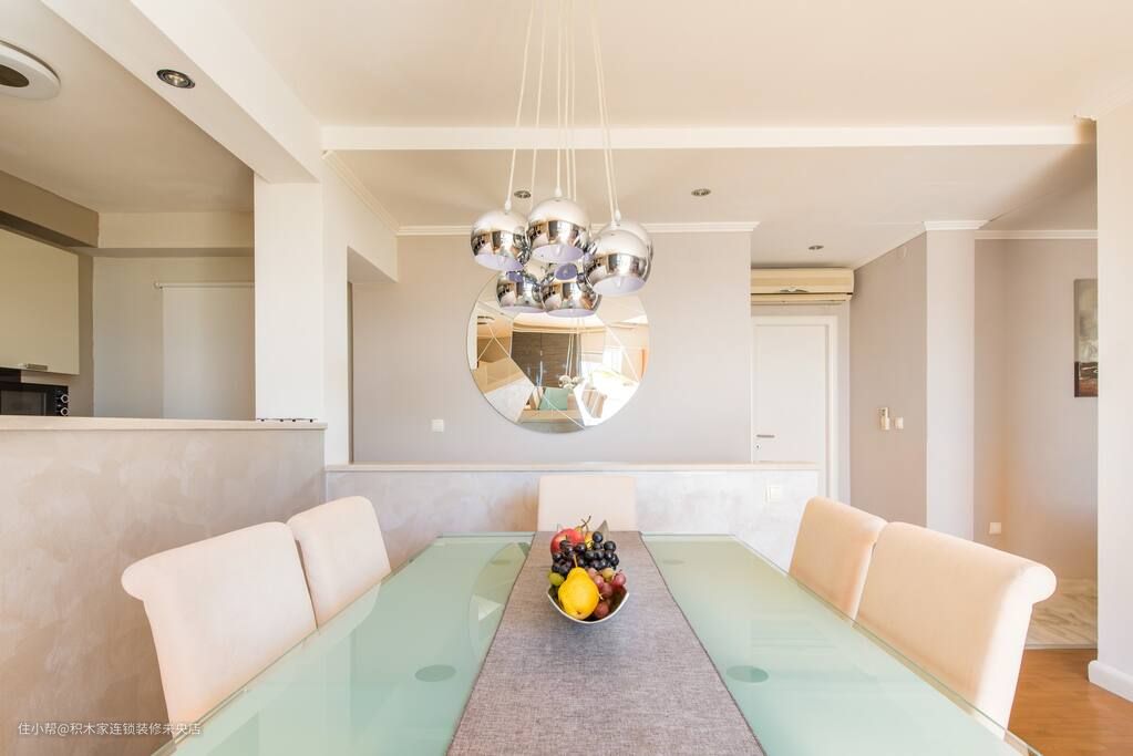 餐厅和客厅相连通,同样采用了简约的日式风格。除了采用和客厅类似的墙面和地面装修,餐桌和餐边柜都采用了淡木色调。同时,选择一些白色原木餐椅,让整个餐厅在保持简约风格的同时,更加明亮。