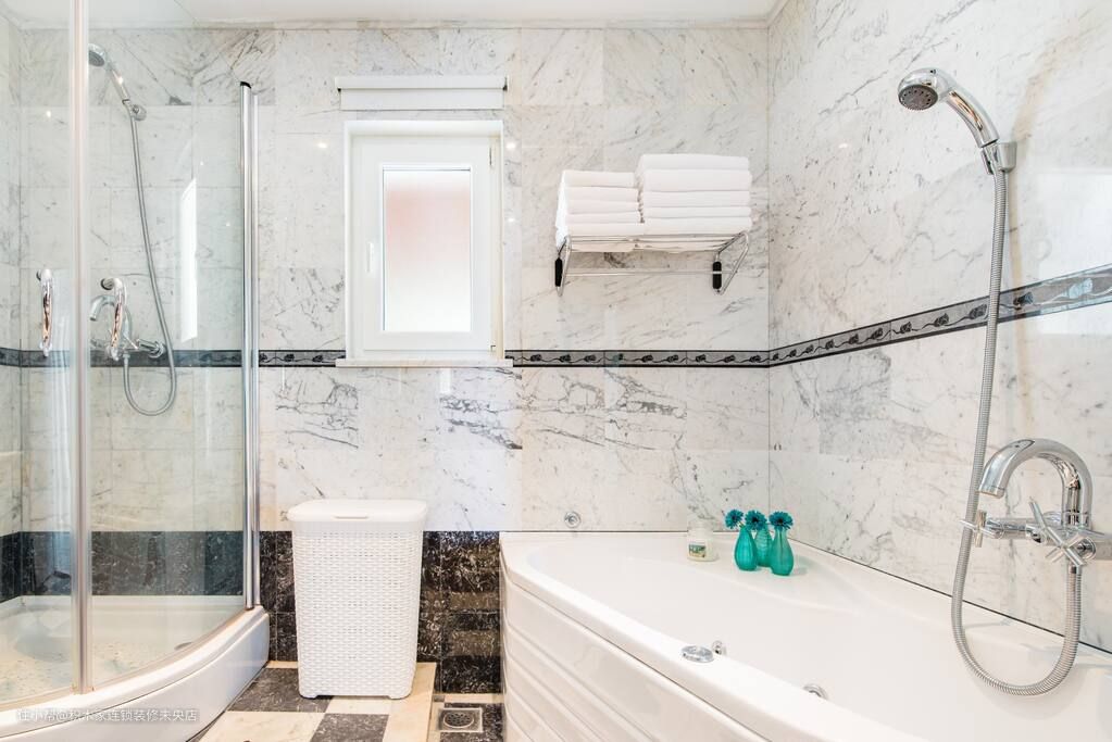卫生间的风格依旧贯彻日式风格的极简精神。墙壁铺贴了400*800的大理石纹路瓷砖,地面则使用了传统的双色小砖造作,白色的洗手盆和马桶衬托出简洁的线条。同时,灯光也设计得温暖而柔和。置物架设计在浴缸的上方,方便随时取拿,卫生间的洗手盆和橱柜使用现代简约的造型,既保证实用性,又保持了日式的品味。淋浴区和洗漱区也做了干湿分离,干湿分离的淋浴区和洗漱区的设计,能够隔离水气,防止发霉和滑倒等问题,使用档次时候也更加安全和舒适。