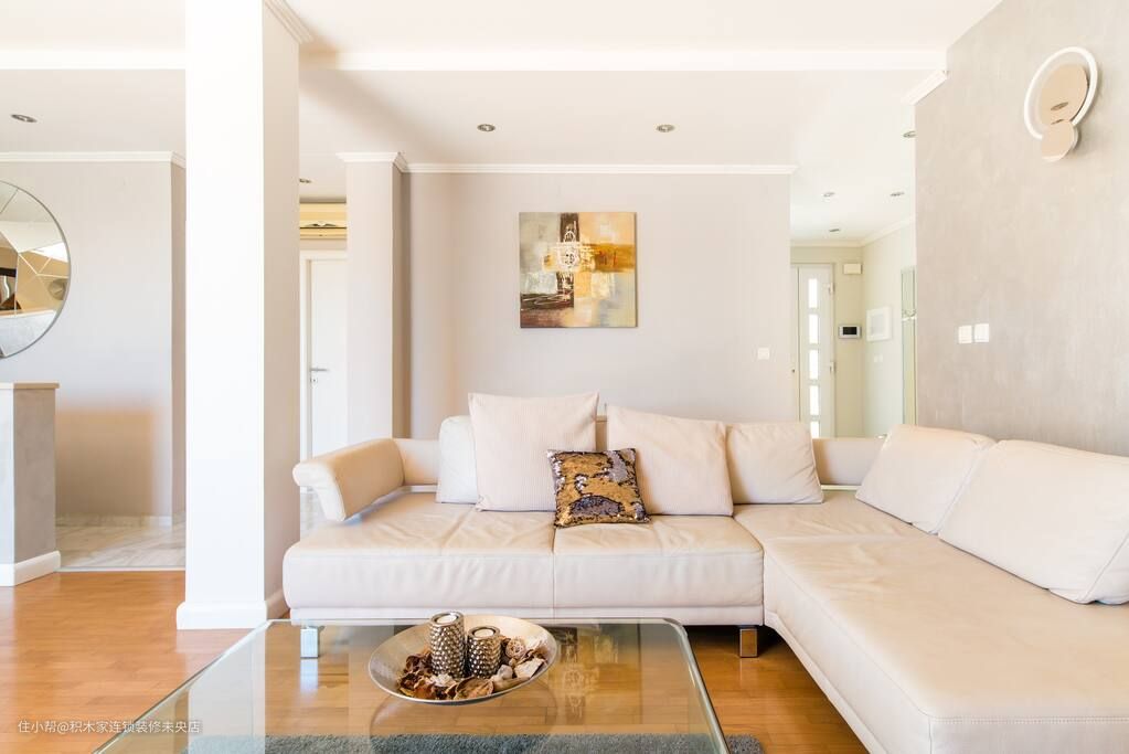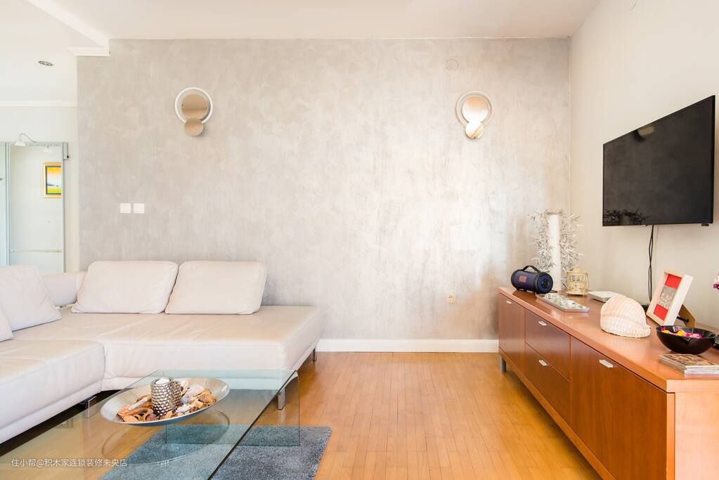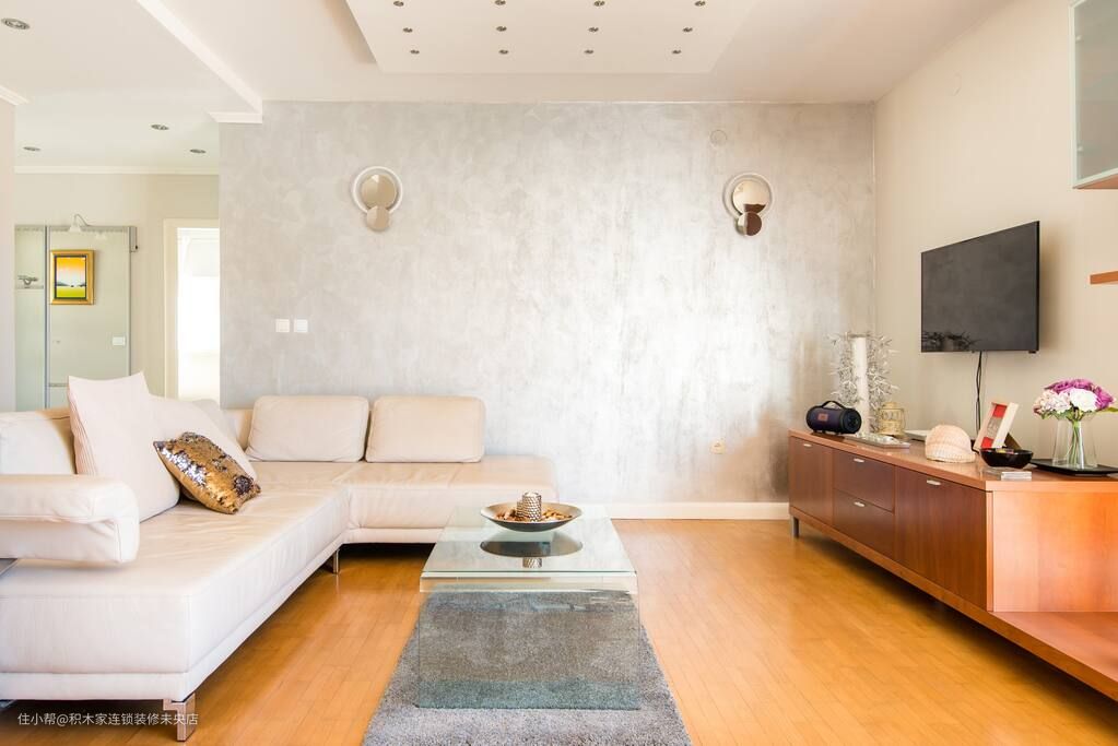 客厅是家居的重要场所,是家人聚集、娱乐休息的地方。小编在客厅的设计风格选择了日式简约风格。主色调以白色为主,并搭配一些淡木色的元素,营造出自然、干净、舒适的感觉。墙面选择米色的石灰质感涂料,使整个客厅更温馨。地面则选用了三步成家独有的原木系复合地板,原木电视柜,均采用色调均匀的色系,钢化玻璃小型茶几,搭配灰色地毯,白色布艺沙发,使得整个空间呈现一体化设计,让空间更为宽敞。
