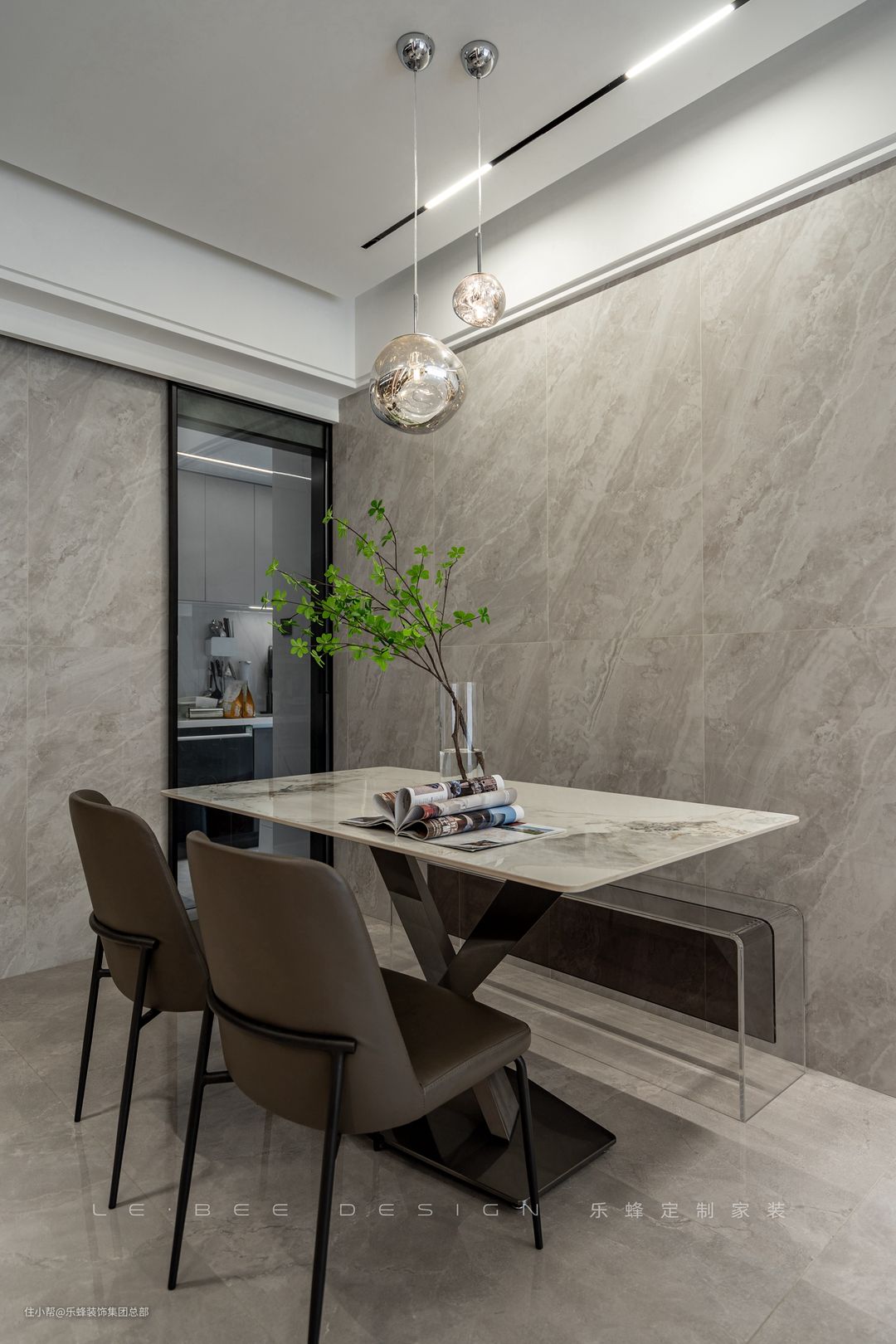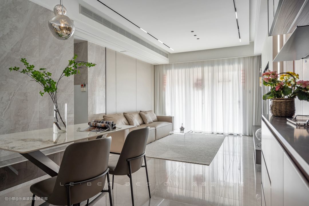 餐厅设计收纳和用餐功能,一边的餐椅设计为卡座的形式,采取的同样是透明亚克力凳,落座便捷,也能减少餐厅空间的占用。
