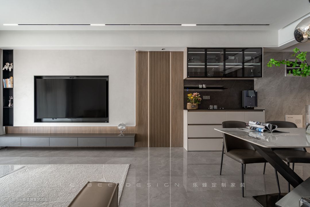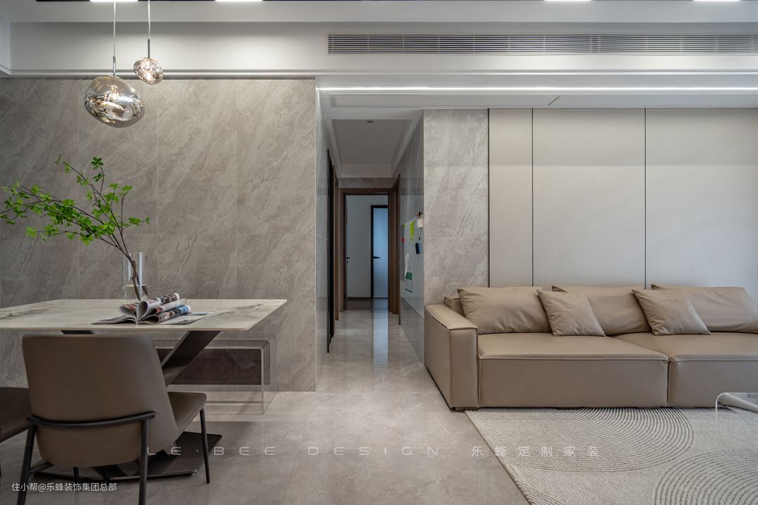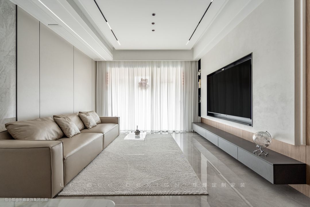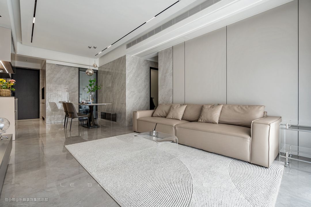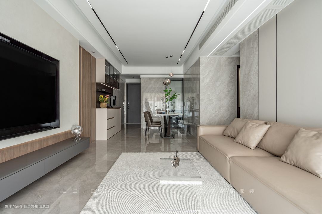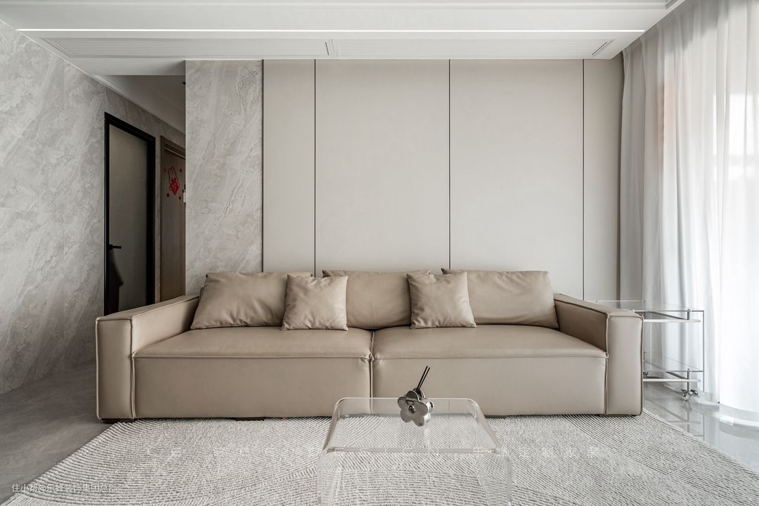 很多人为了追求华丽而放弃了轻盈感,轻盈感之下的松弛感却渐渐成为越来 越多人的追求。客厅选择了赏心悦目为主的舒适设计,沙发背景选择瓷砖和护墙板拼接,不同材质之间也能达到惊人的和谐。 沙发选择米灰色真皮沙发,落地款更具居家氛围,造型松软,舒适度不输布艺沙发。为了减少客厅的笨重感,边几和茶几都选择了透明亚克力材质,仿若无物。 电视背景主打营造层次感,利用石膏板增加层次,配合小面积的展示柜作为点缀。灯带作为氛围感利器,被运用在了电视背景和吊顶之中,材质有了光线的照耀,更加熠熠生辉。