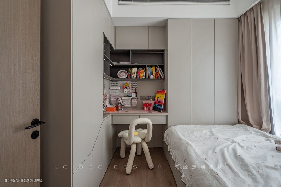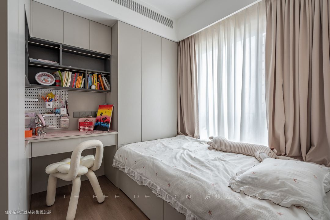 儿童房设计为榻榻米的形式,将空间内的收纳和功能最大化。作为女生使用的房间,房间内选择了柔和舒适的莫兰迪色系,打造温馨舒适的空间。