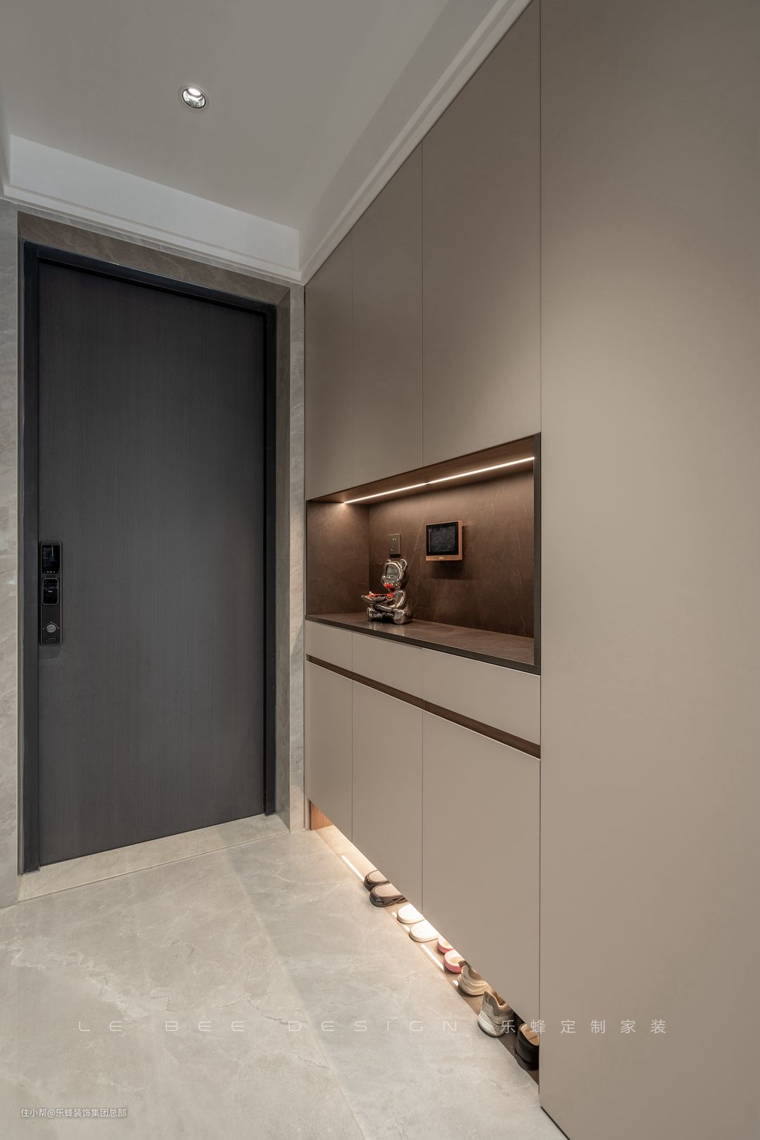 靠墙设计一组玄关柜,奶咖色的面板和深棕色结合,营造温润质感。玄关柜利用了极简的隐形把手设计,底部做了悬空,方便日常拖鞋和便鞋的换取。