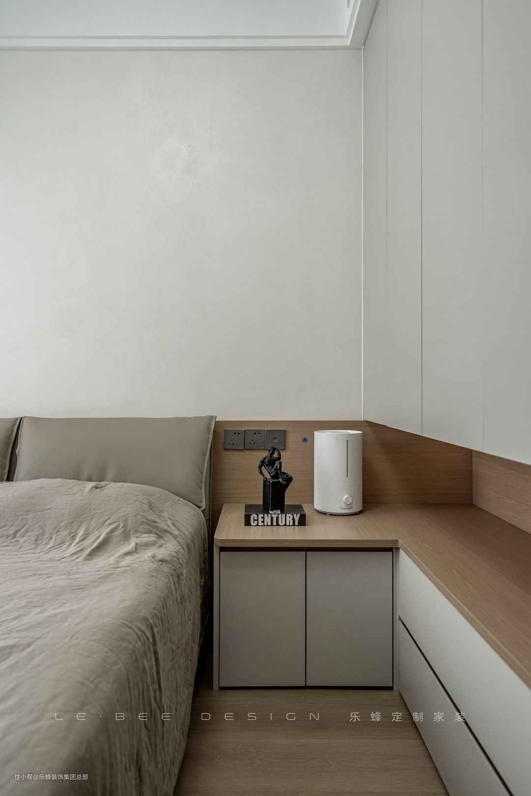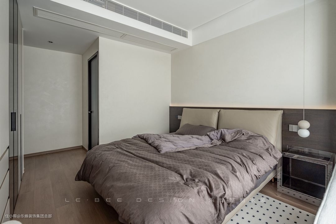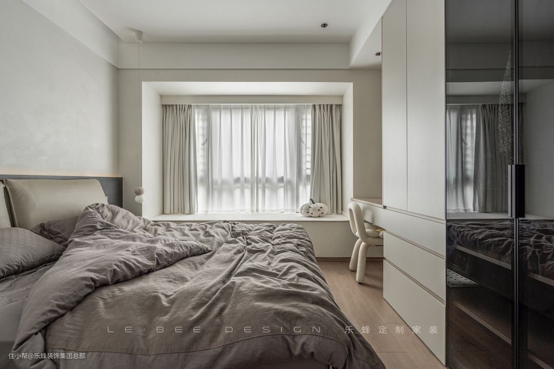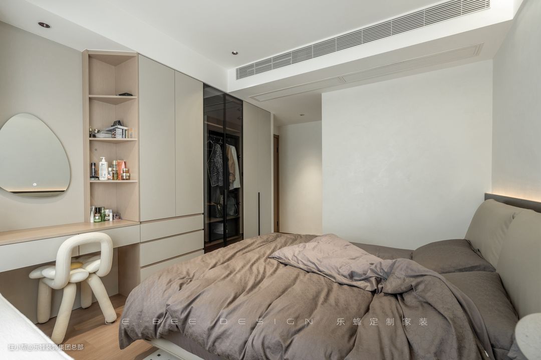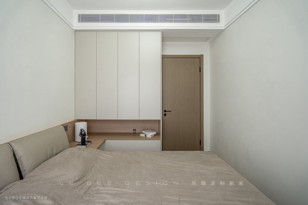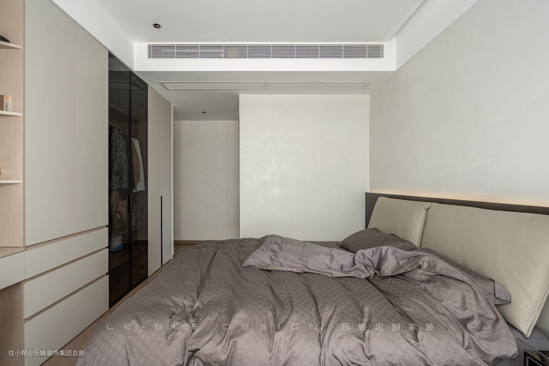 次卧舍弃了传统的床头柜,将床头柜设计为和衣柜一体的形式,空间的利用更加灵活,既不会影响衣柜的使用,床边置物空间也得到了增加。
