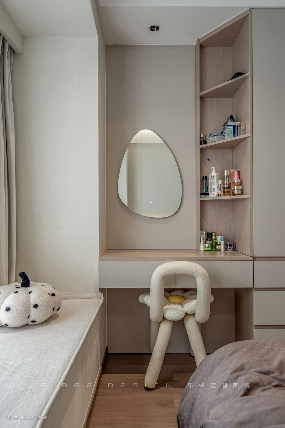 主卧墙面选择了艺术涂料进行装饰,艺术涂料自带纹理,色彩的呈现也不生硬。床头背景设计了木质墙裙,用以保护墙面的同时也能增加主卧的氛围感。 收纳设计于床尾处,独家定制的衣柜和梳妆台相结合,梳妆台设计斜角收纳架,不占空间。收纳柜选择和墙面一致的色彩,柜体和墙面融为一体,主卧的整体性得到加强。