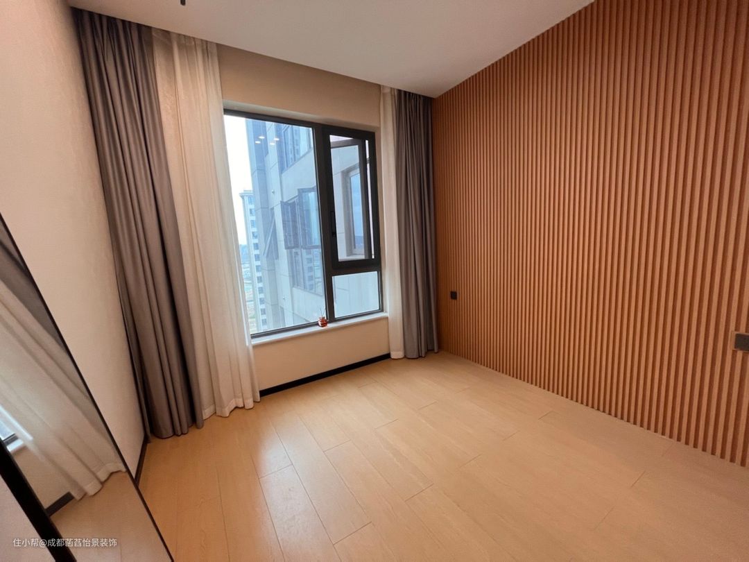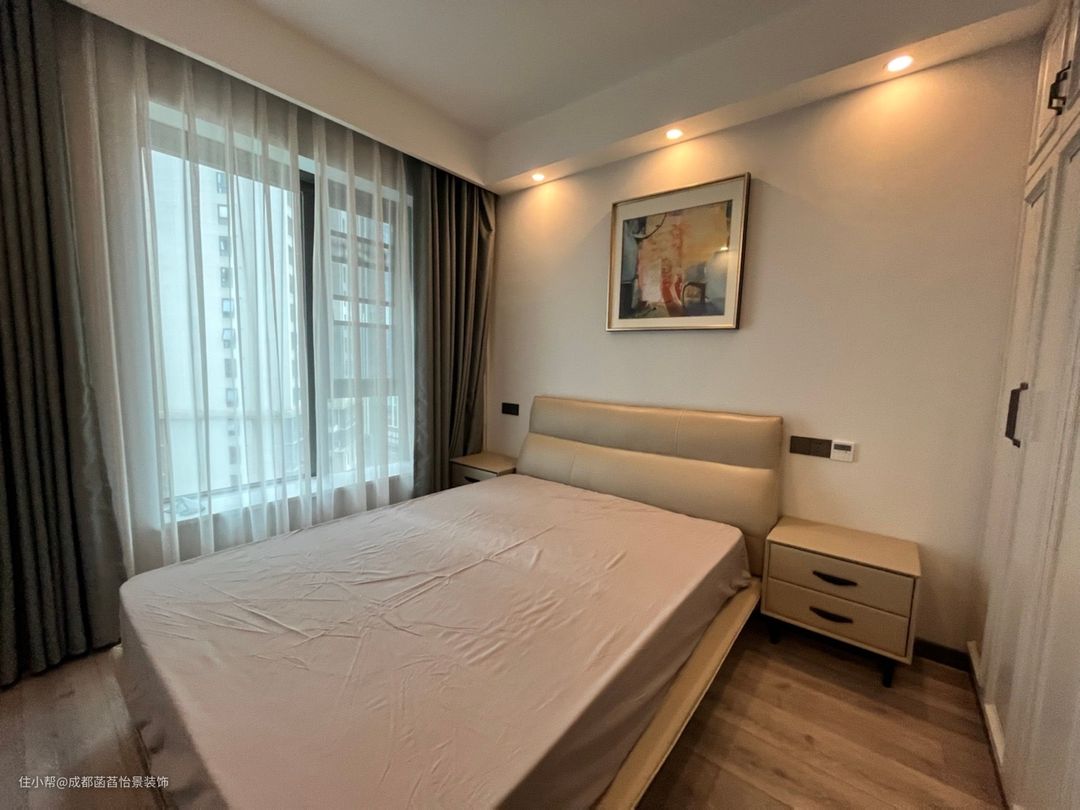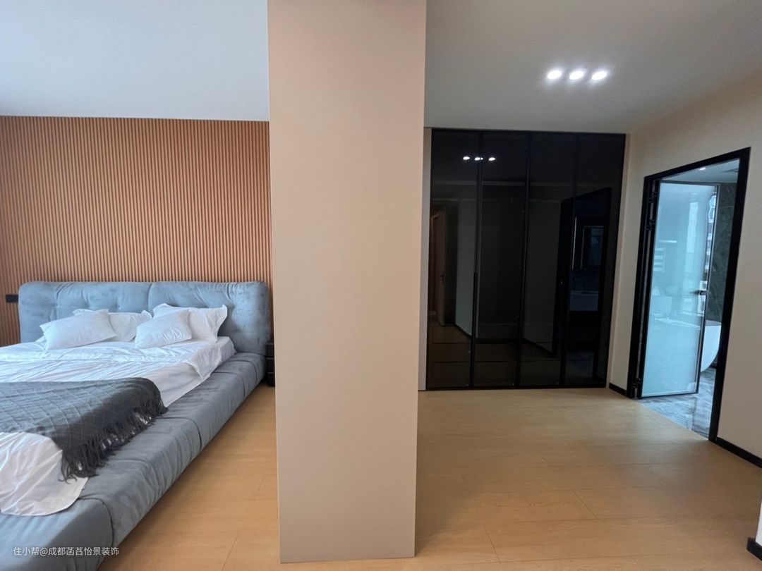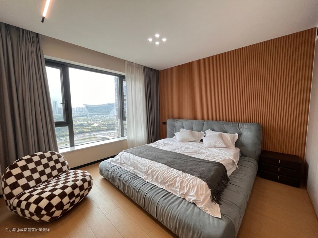 卧室也是大玻璃窗,室内通透明亮。背景墙做了个性定制,简约又温馨。
