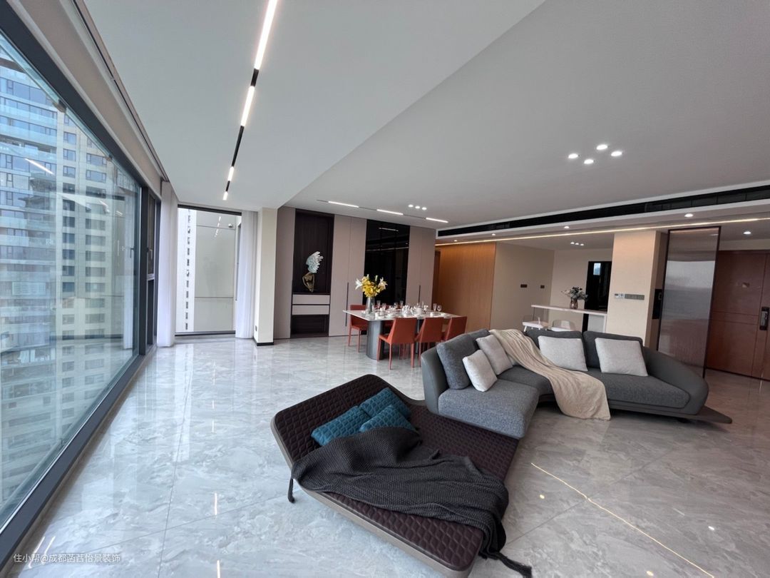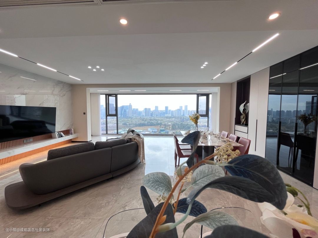 客餐厅一体设计,沙发背后就是餐桌,动线流畅。无主灯设计,让空间更显开阔大气。餐桌背后做了定制餐边柜,增加收纳。