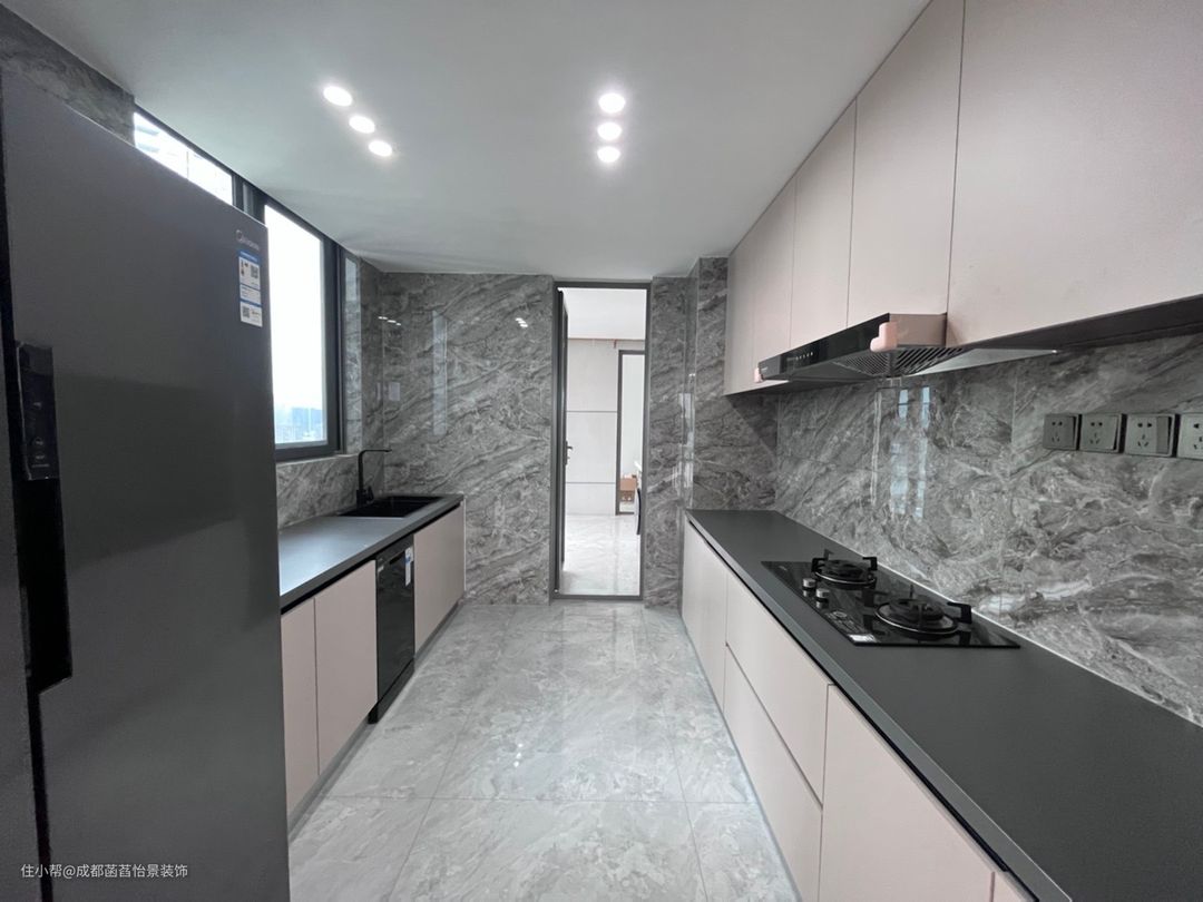 厨房做的瓷砖上墙设计,灰色纹理时尚且更耐脏。吊柜和地柜都做,增加收纳,通顶设计减少卫生死角。
