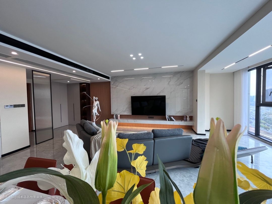 客厅将阳台打通,大玻璃封窗,室内更通透明亮。电视背景墙做的岩板墙面,电视机悬空,下方做了台子放遥控器、小摆件等,提升艺术氛围。不规则灰色沙发,简约又耐看。