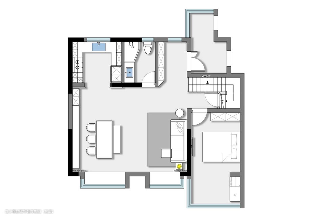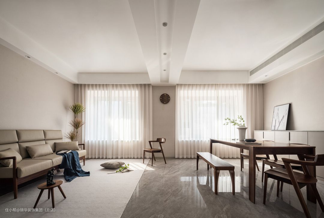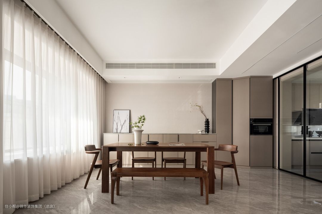 每一寸空间都充满设计的细节,比起单纯的平面更显张力。客厅与餐厅串联,横厅的结构。全开放的布局营造空间的深度,使整体空间更加通透、大气。大面积的灰白色和胡桃木的碰撞,增加了些许的柔和,温暖了生活的意趣。当代人的生活习惯电视不再是我们居住空间中必不可少的一部分了,也不再是客厅的中心了,让日常呆的最多的餐桌成为中心,家人在餐桌上,在沙发上围坐一起谈天说地,创造更多的交流环境。灯光上采用无主灯的设计。线性灯、射灯、筒灯、壁灯等等满足不同照明需求,有层次的“点”灯设计,为空间带来丰富的层次感。