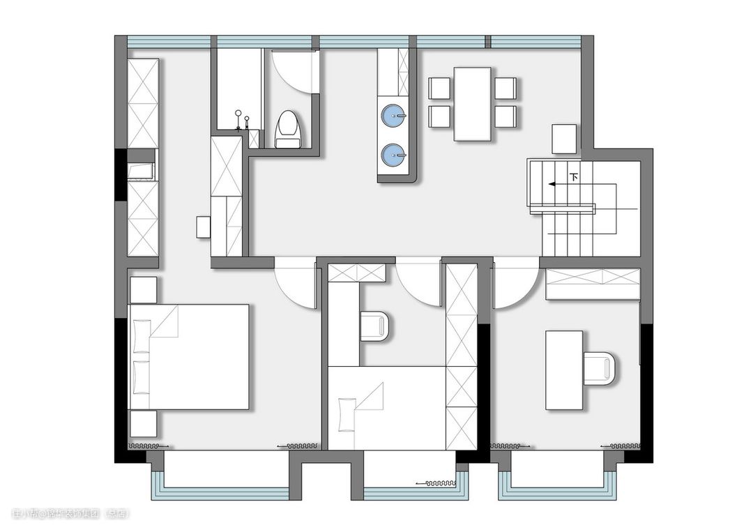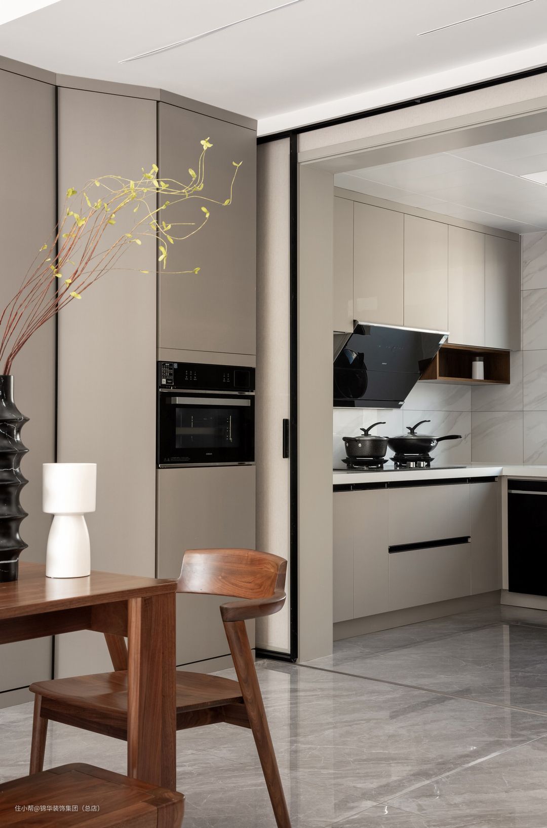 断开、接续的空间手法,是缓冲,是转换。有着界定的空间,却没有彼此的界线。餐厅和厨房用吊轨移门去界定,空间隔而不断,黑色极窄边框的移门也成造就了空间的气场。
