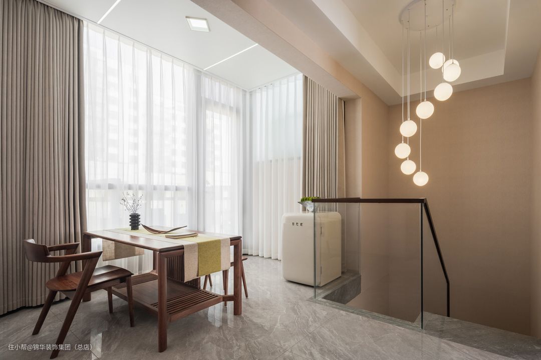 胡桃木的格调一直延续到二楼,原本的露台扩到室内顶上装饰选用的是蜂窝大板加线性灯,实用简洁,刚到2楼映入眼帘是开阔的休闲厅,也是女主人最爱喝茶和接待朋友的空间。休闲区的外面保留了一个小露台,放置了星星灯,是夜幕降临下的浪漫。