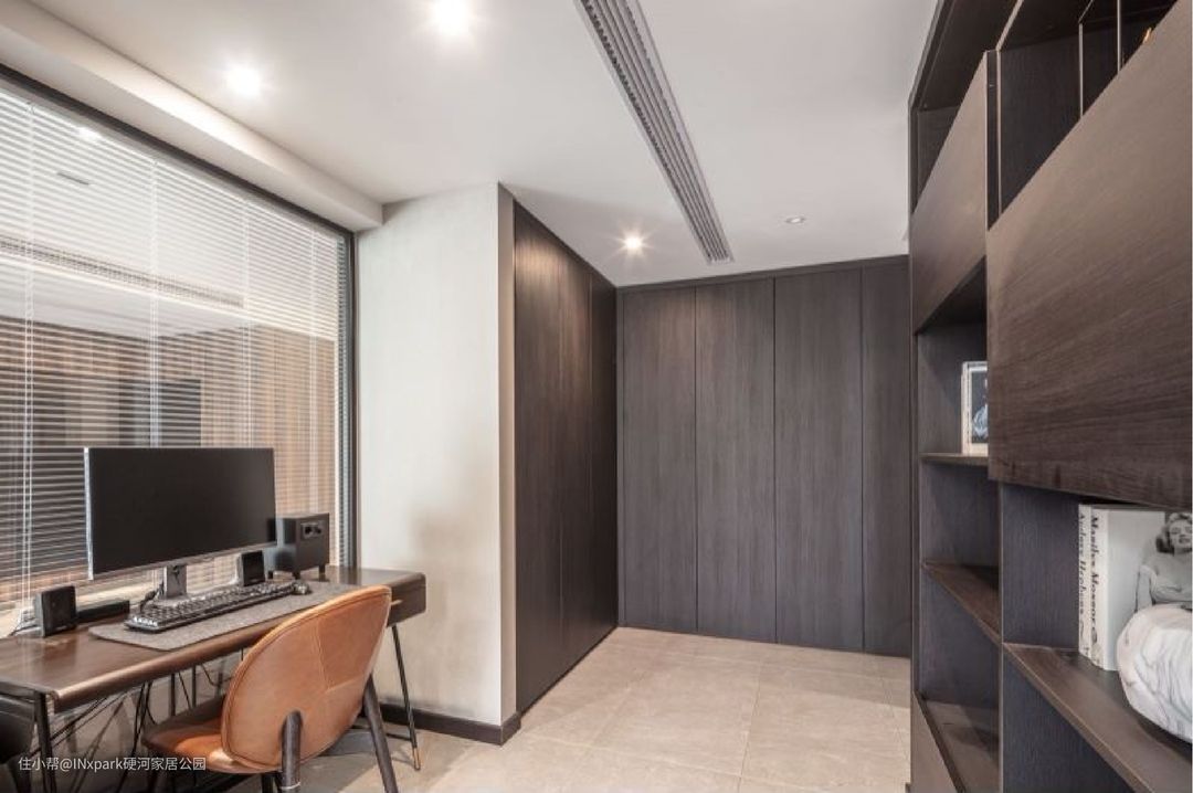 次卧书房,百叶窗设计视觉轻巧通透,视觉上也能放大空间,让空间更有设计感。