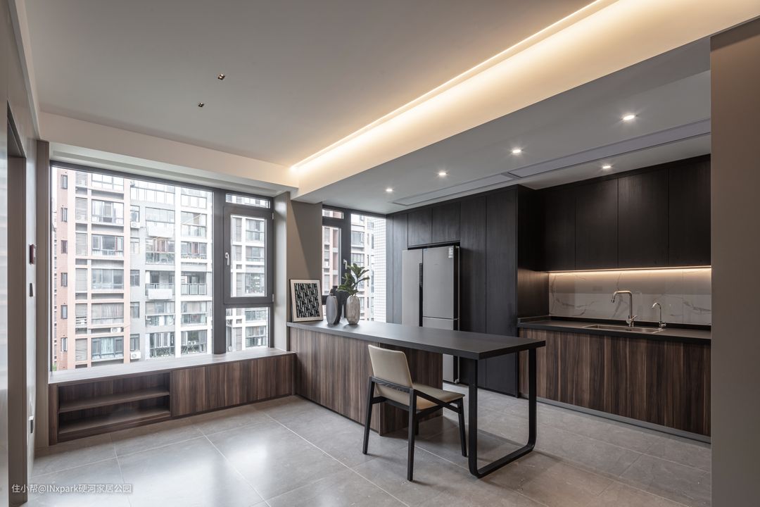 餐厅厨房一体,开放式厨房设计,餐桌靠窗,用餐,静享美食之余也享受着大自然最美的阳光浴,这就是幸福的源泉。
