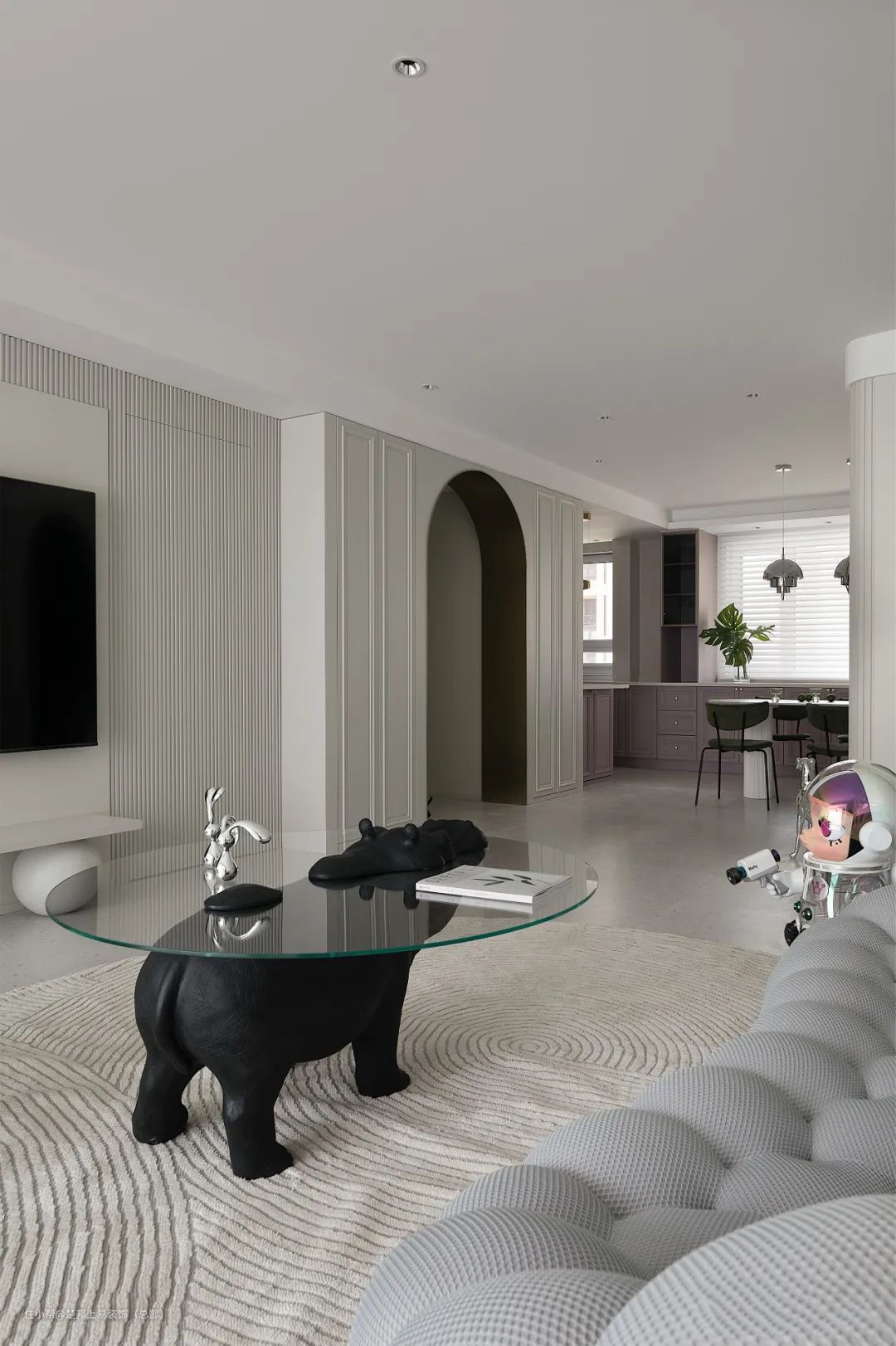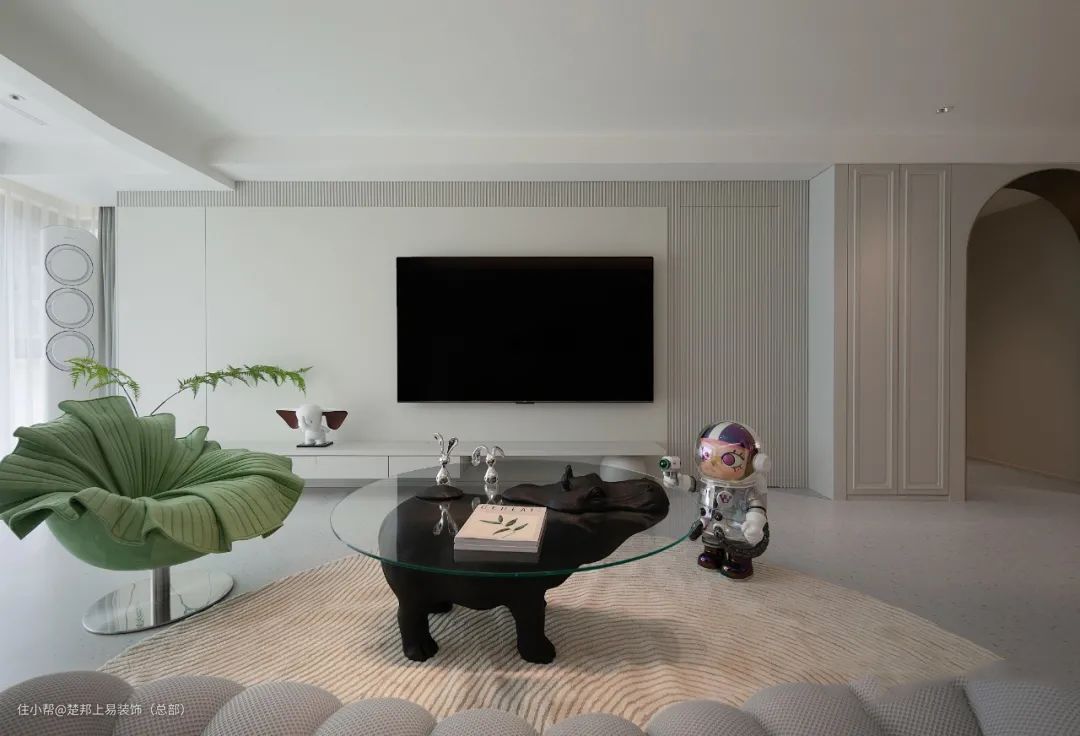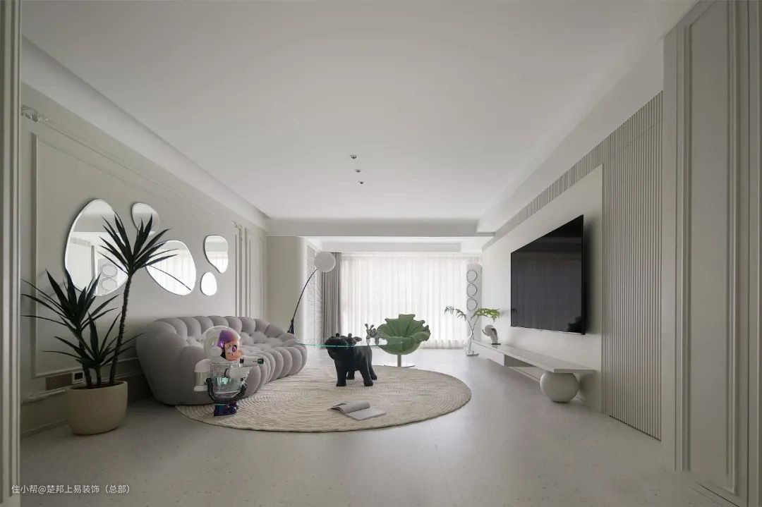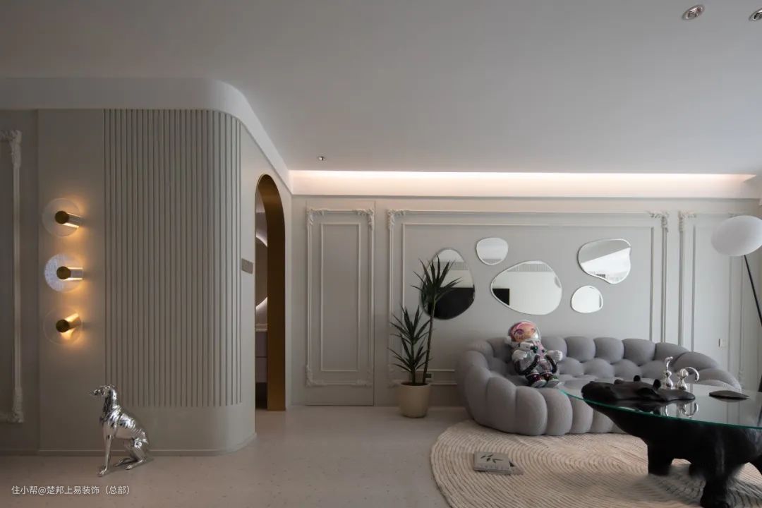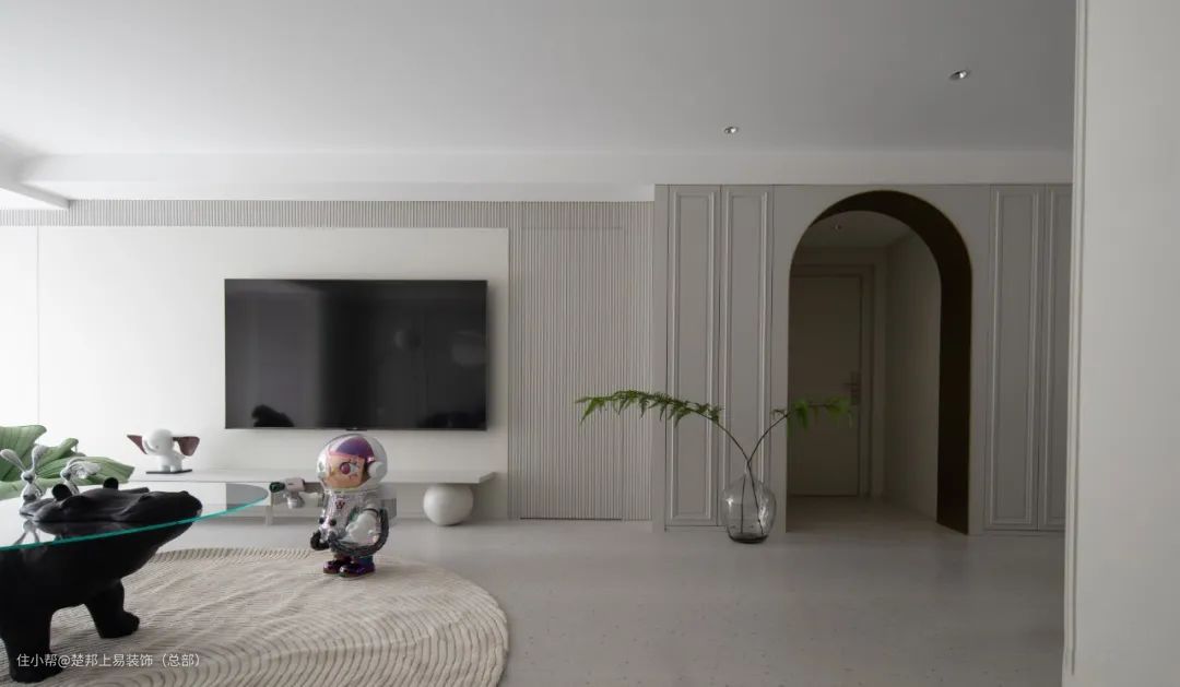 整个空间以白色色为主,阳台和客厅连接打通,空间更开阔,进入卧室的房门做了隐形门设计,美观又整洁,沙发背景墙做了玻璃拼贴的设计,艺术又有设计感~