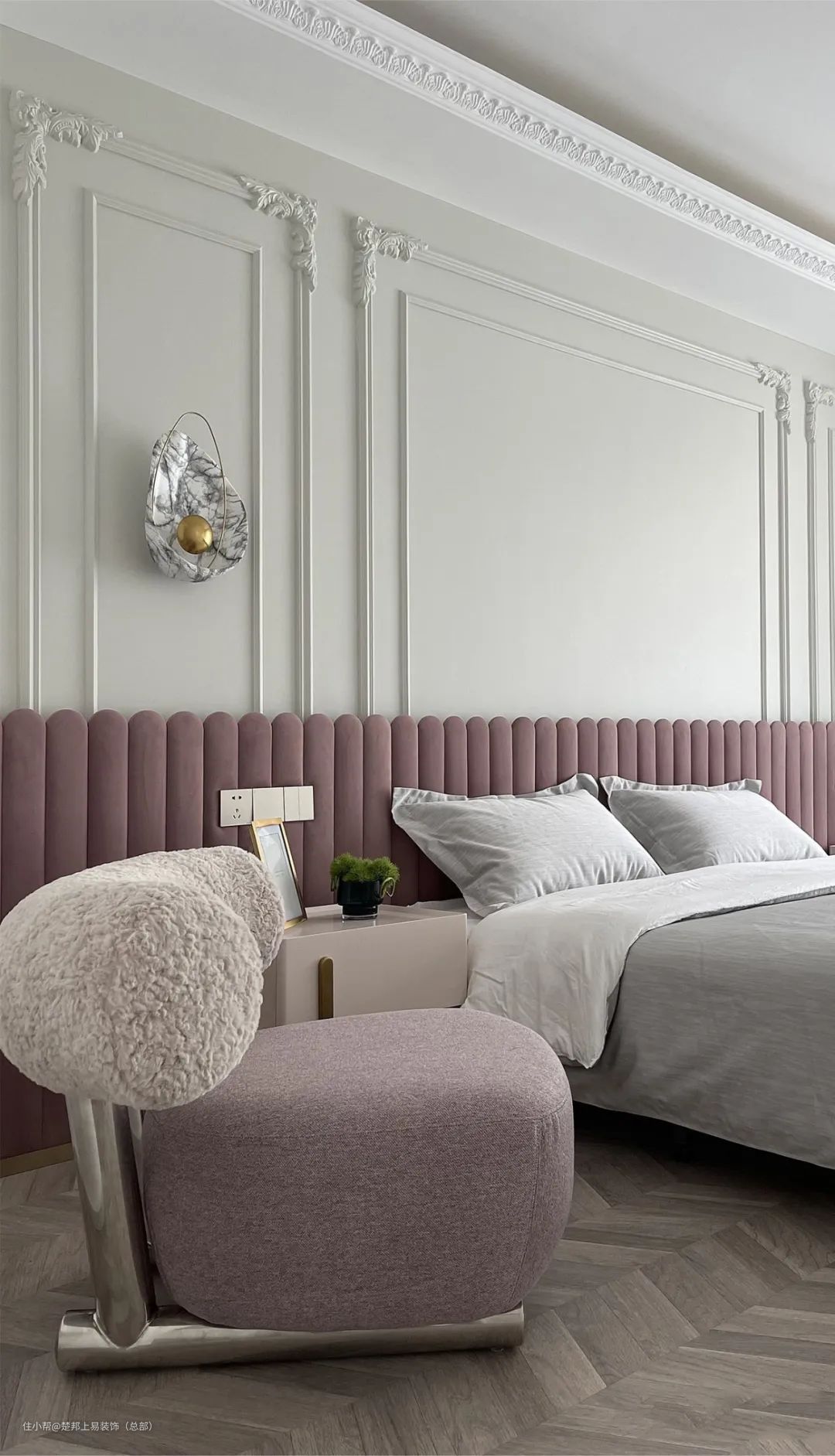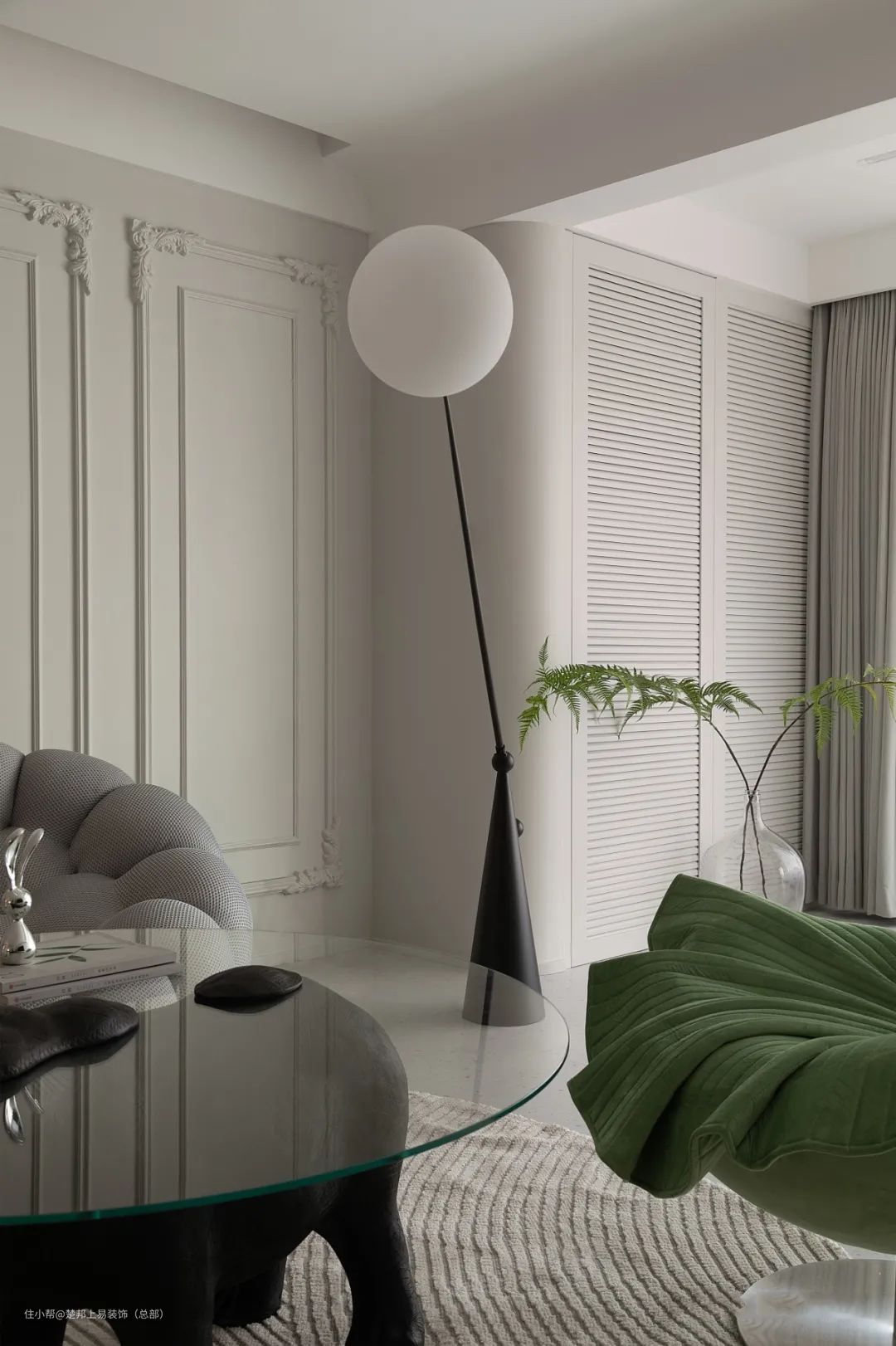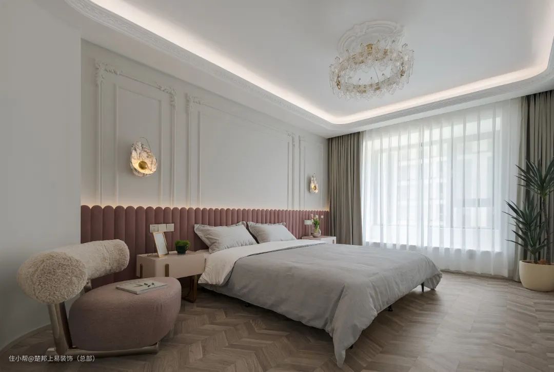 整个空间以白色色为主,阳台和客厅连接打通,空间更开阔,进入卧室的房门做了隐形门设计,美观又整洁,沙发背景墙做了玻璃拼贴的设计,艺术又有设计感~