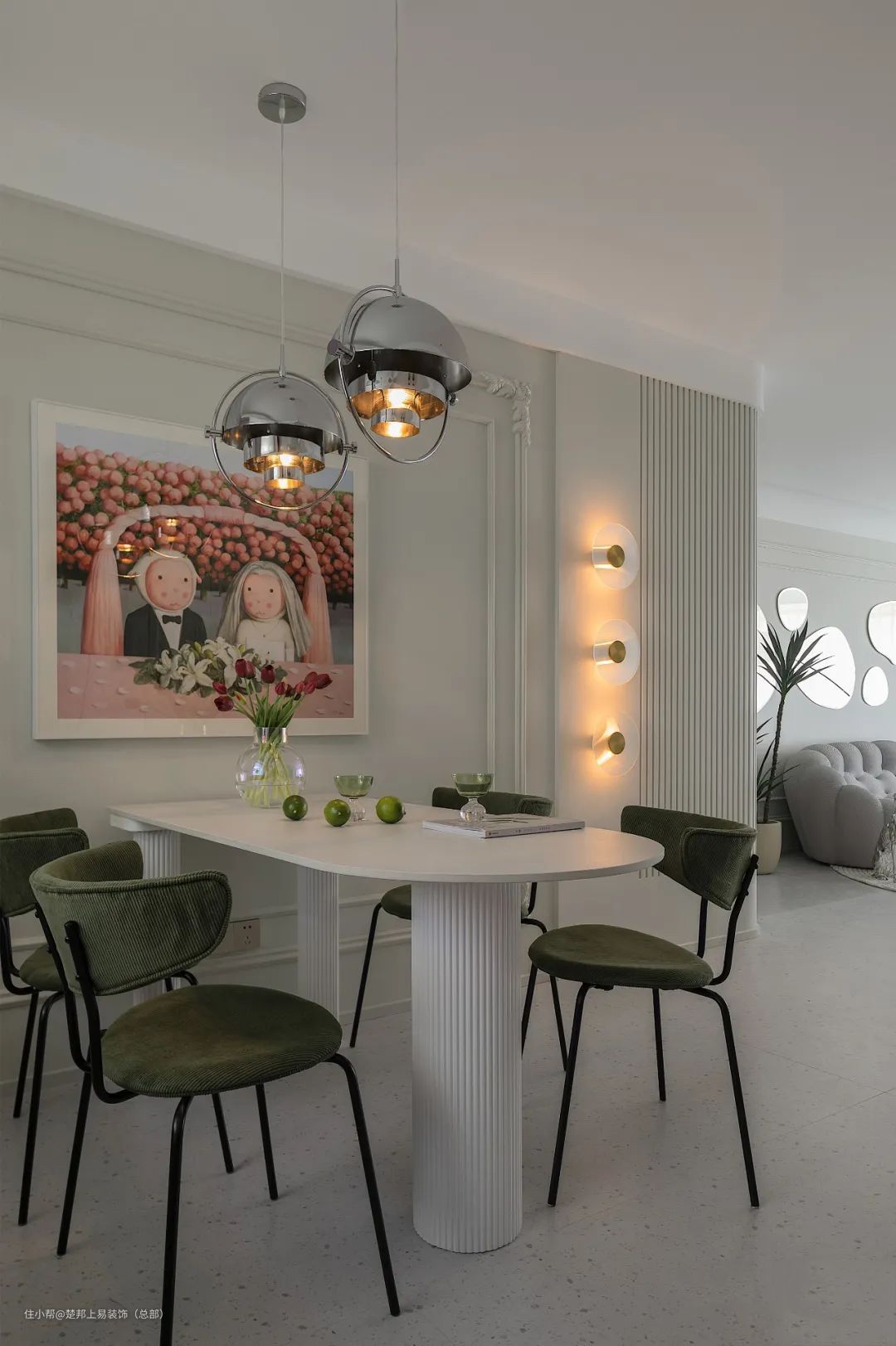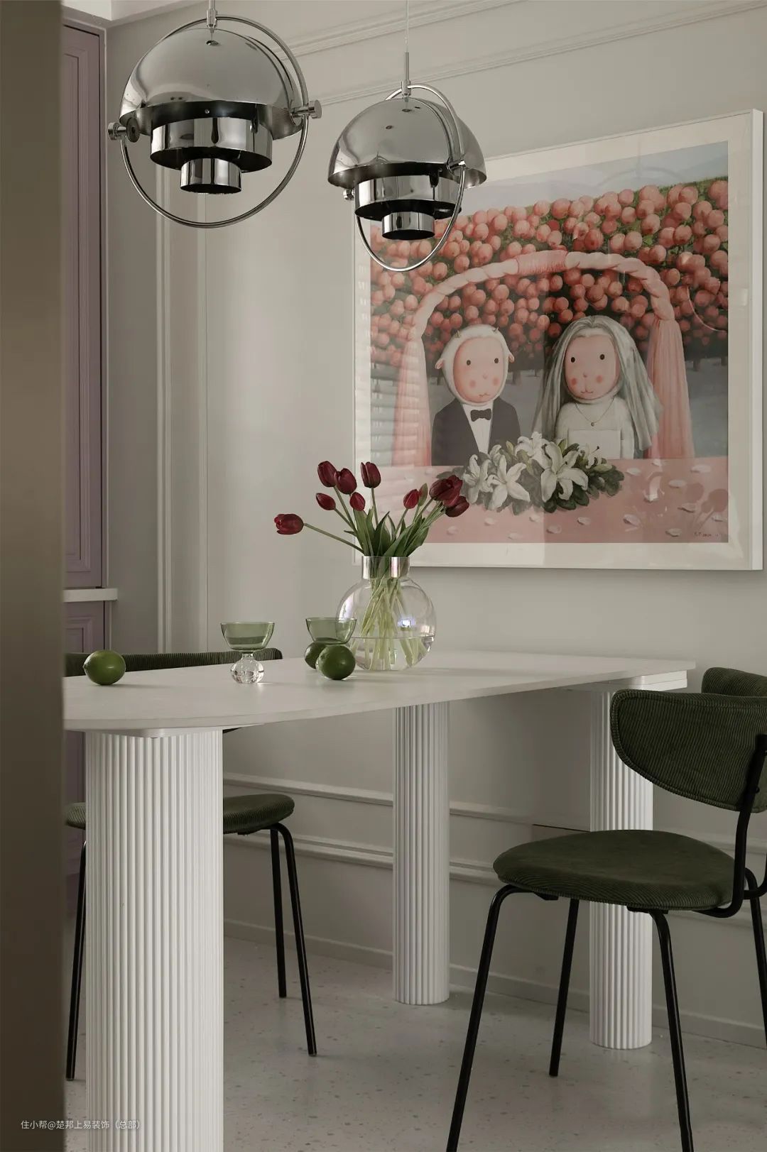 餐厅餐桌选用白色桌面,搭配绿色绒面座椅,很有质感,墙面的装饰画是结婚的画,搭配起来很应景~
