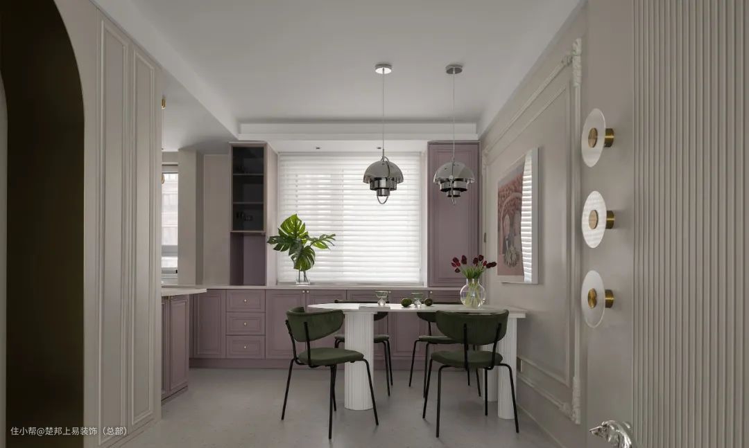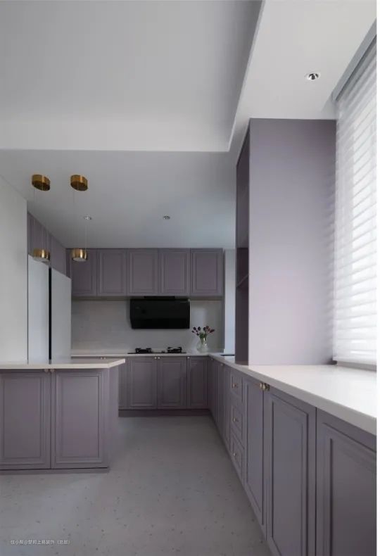 厨房做L形操作台,操作空间大,动线更流畅,选用紫色做柜门,上下双柜,增加收纳空间~