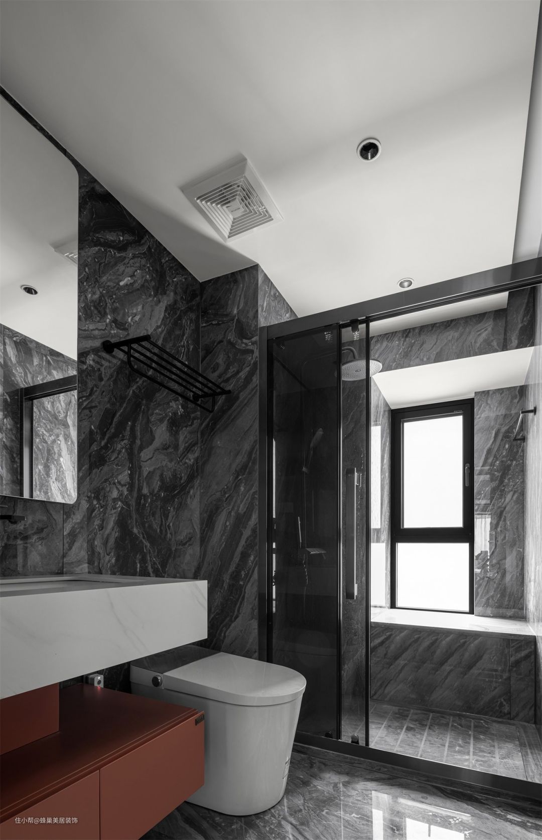 卫生间光滑质感黑色墙地砖和温暖饰面的浴室柜,共同奠定了卫生间干净通透的基调。