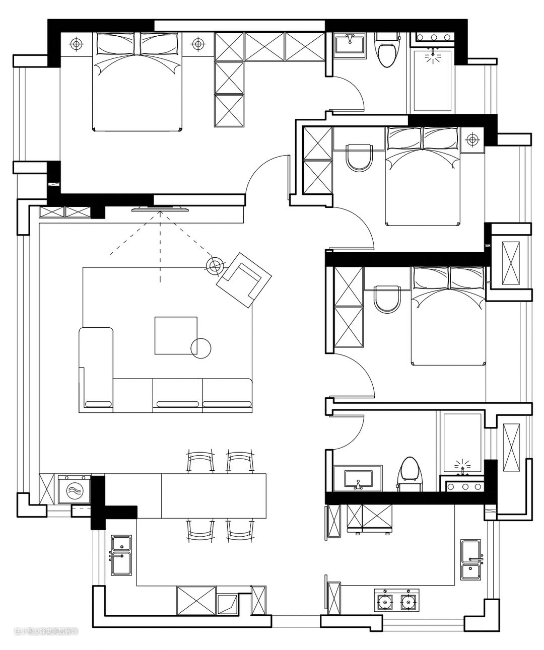 厨房与餐厅相连, 呈现U字型动线,餐桌充当备菜区域,家人在此处共同准备晚餐为美食注入了生命力,中厨区域设置了黑色暗门,延伸更为宽阔的尺度,将约用餐区域的美感与厨房区域的烟火气息进行柔和的过度。