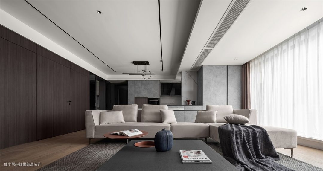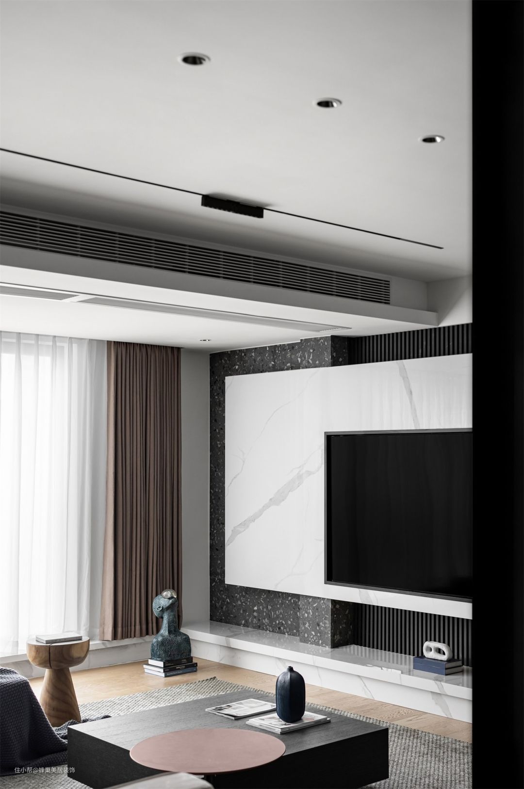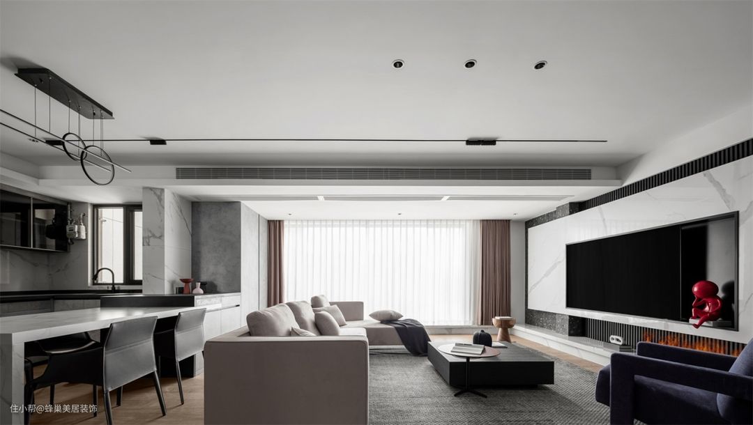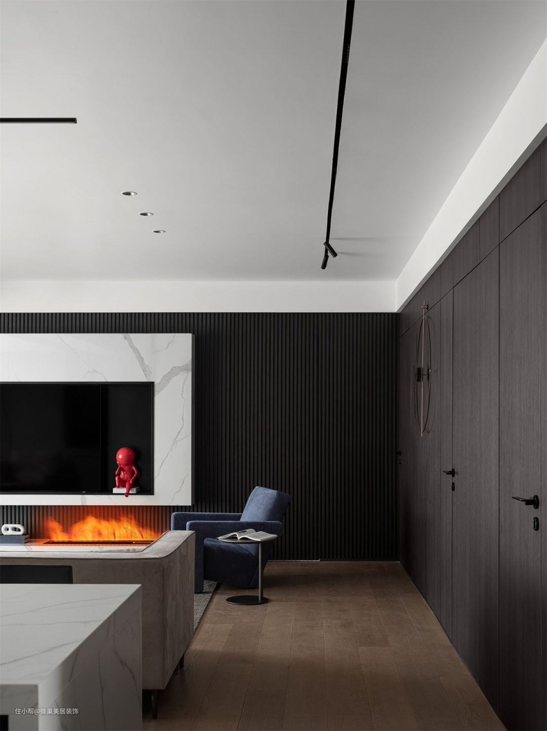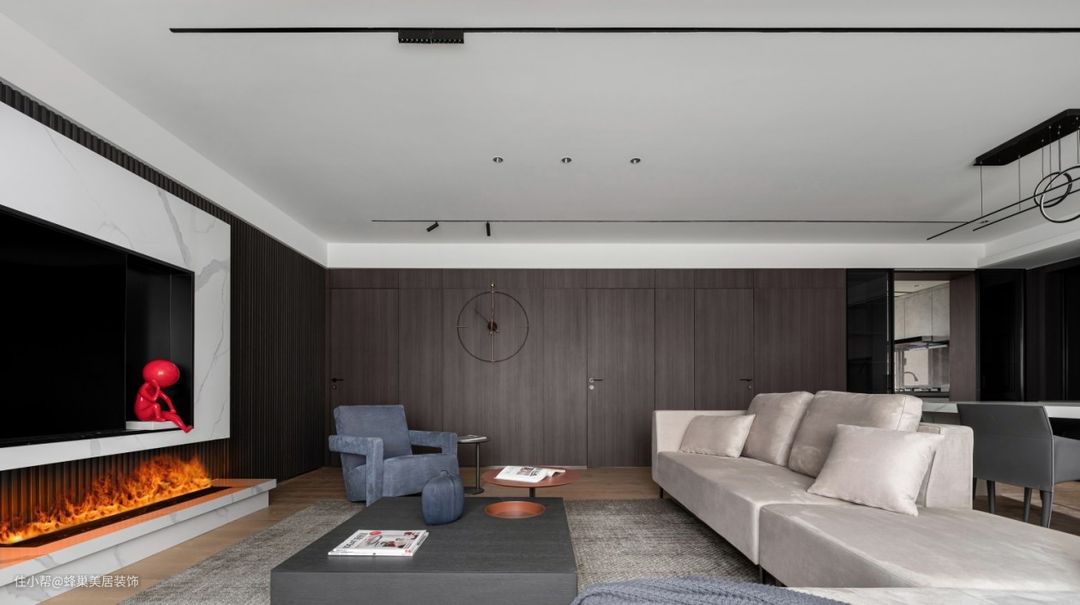 客厅空间总体以浅色调为主,搭配哑光质感家居,电视背景墙注入温润的石材,下方跳动的火光,无一不展现居者高级感的生活品质,通铺浅色系木地板,搭配地毯布艺的柔软感,中和了硬朗线条带来的清冷感。冷暖色调和舒缓肌理共同构建了客厅空间的艺术气质。