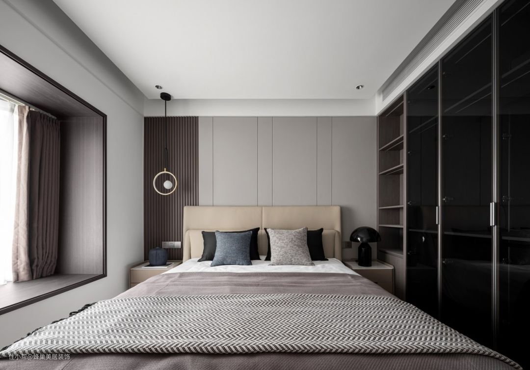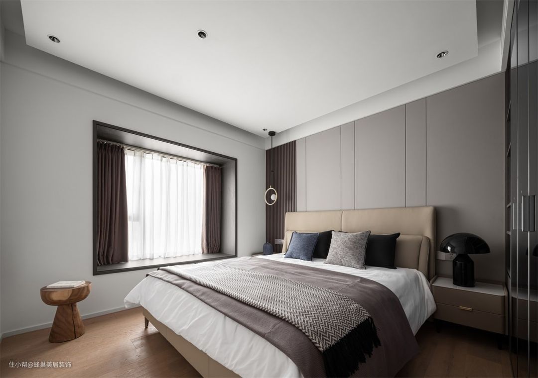 设计师通过询问屋主的一些生活习惯,从进门开始由浅入深,通过细腻质感家居、沉稳质感护墙板打造舒适、放松的入睡环境。床边设置深色半透明衣柜,使整体空间兼具收纳性能与美学惊喜。