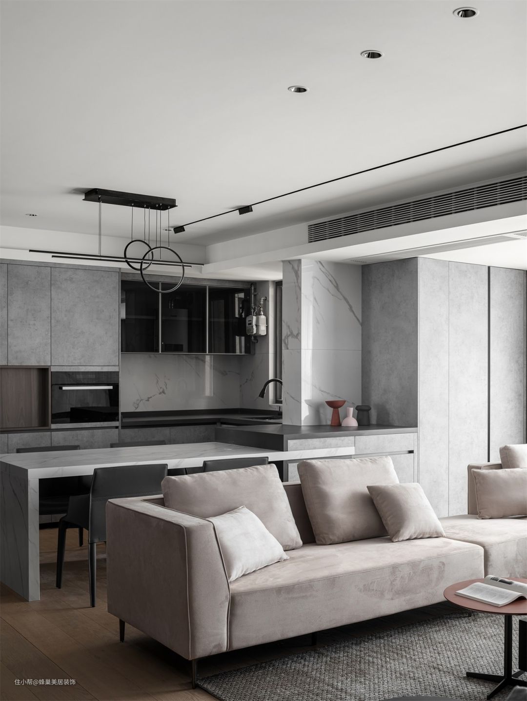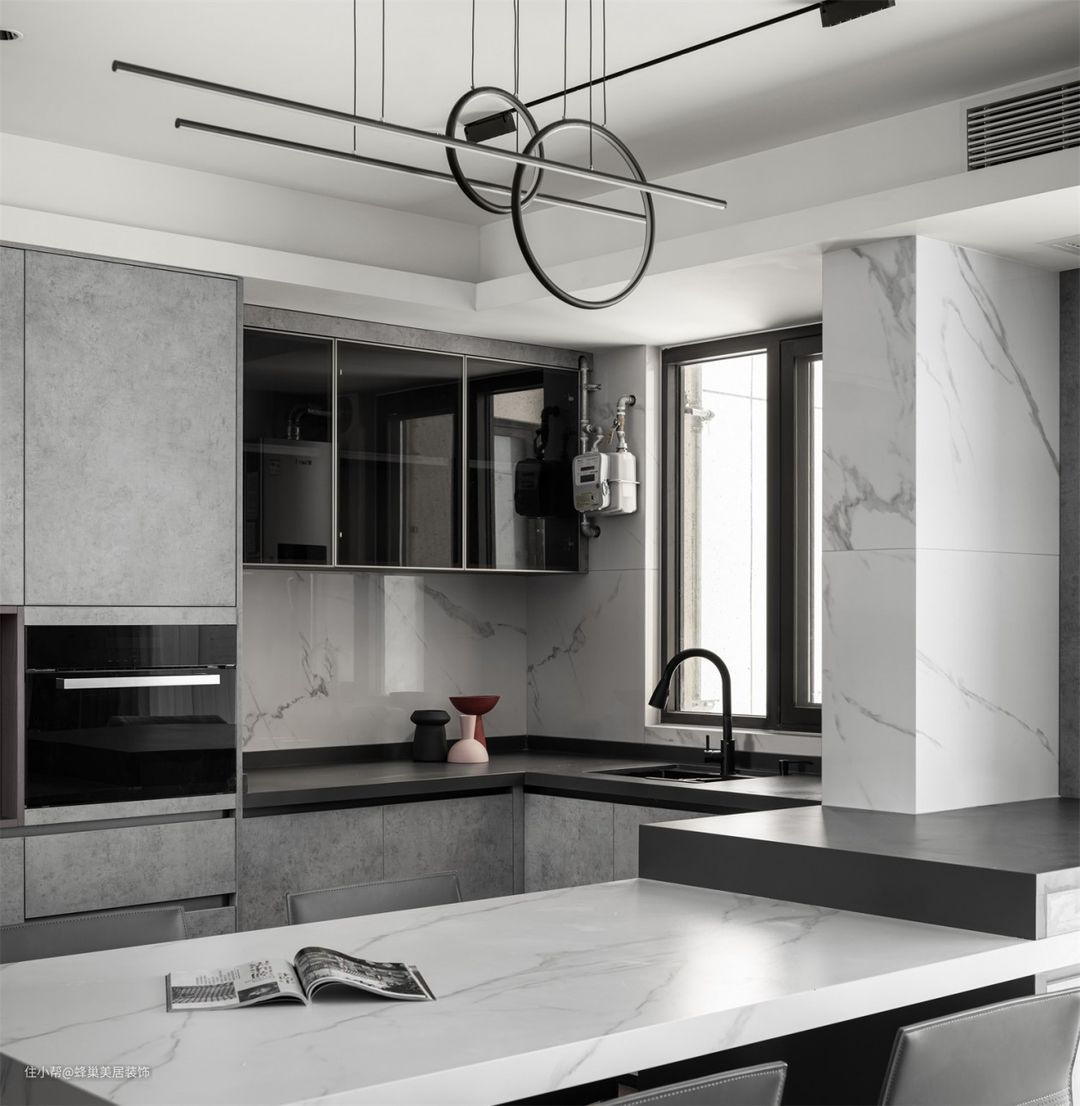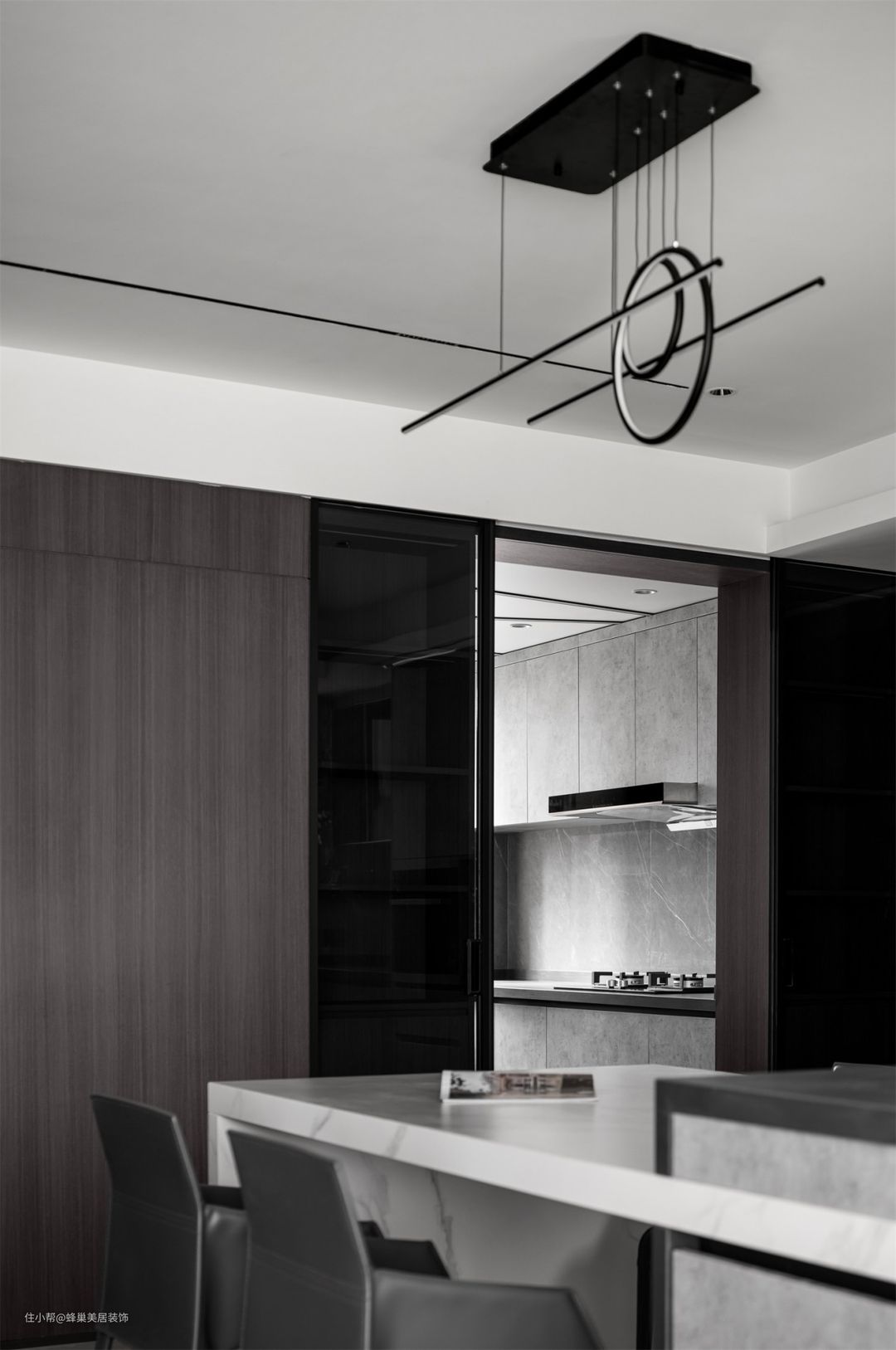 餐厅与中岛台融为一体,以黑白灰为底色,勾画餐厅的细腻形态,顶部的黑色艺术线条灯增添了温馨的用餐氛围。