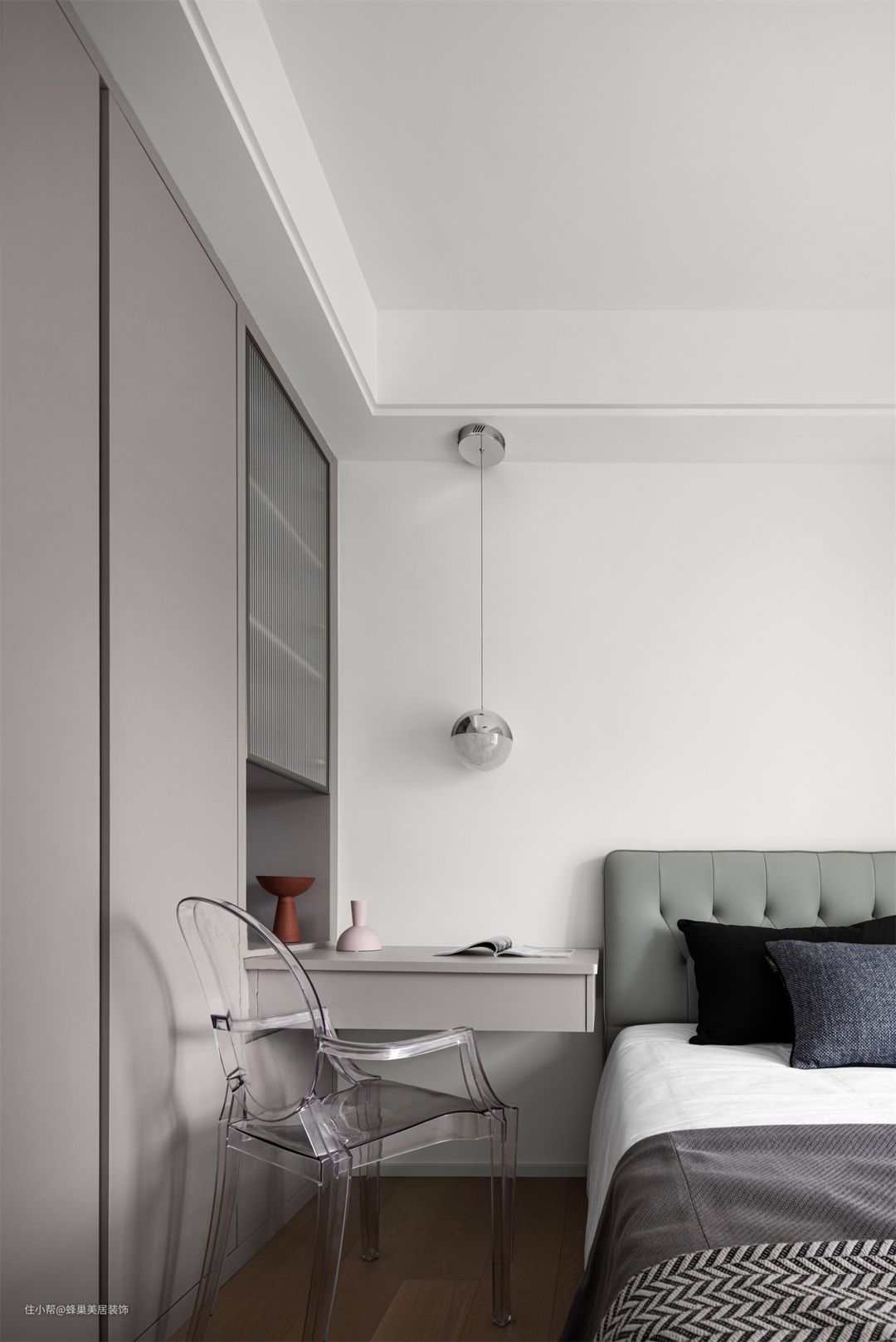 次卧空间继续保持着冷灰色调,衣柜与床头桌做了一体化设计,透明椅赋予了卧室空间轻盈的姿态。