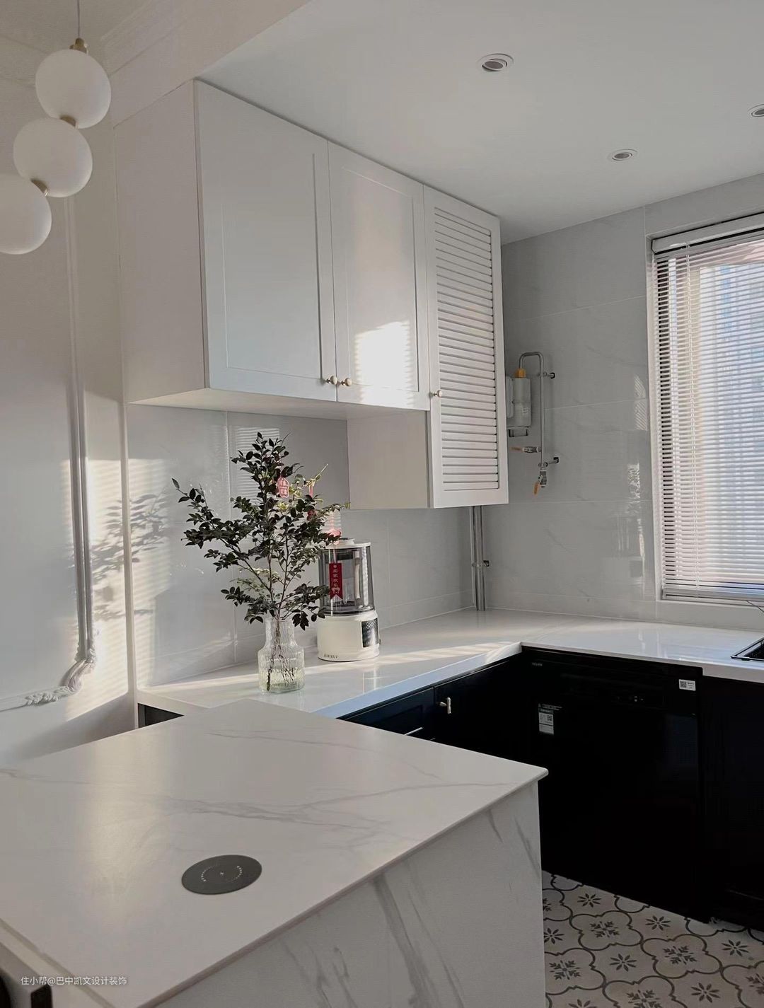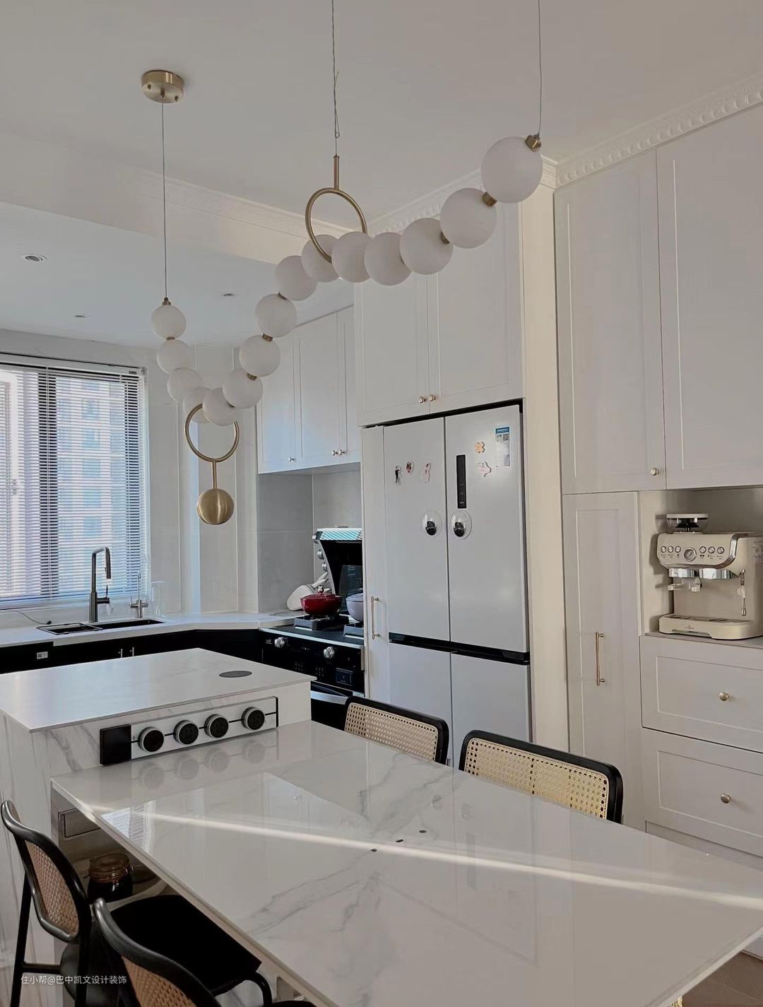 开放式西厨,餐桌采用导台设计,配色也是经典的黑白配