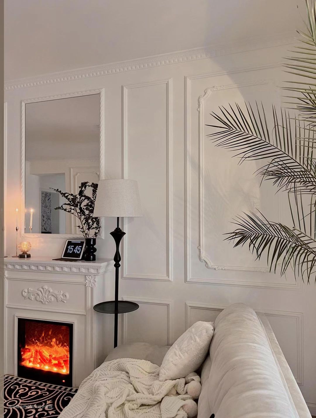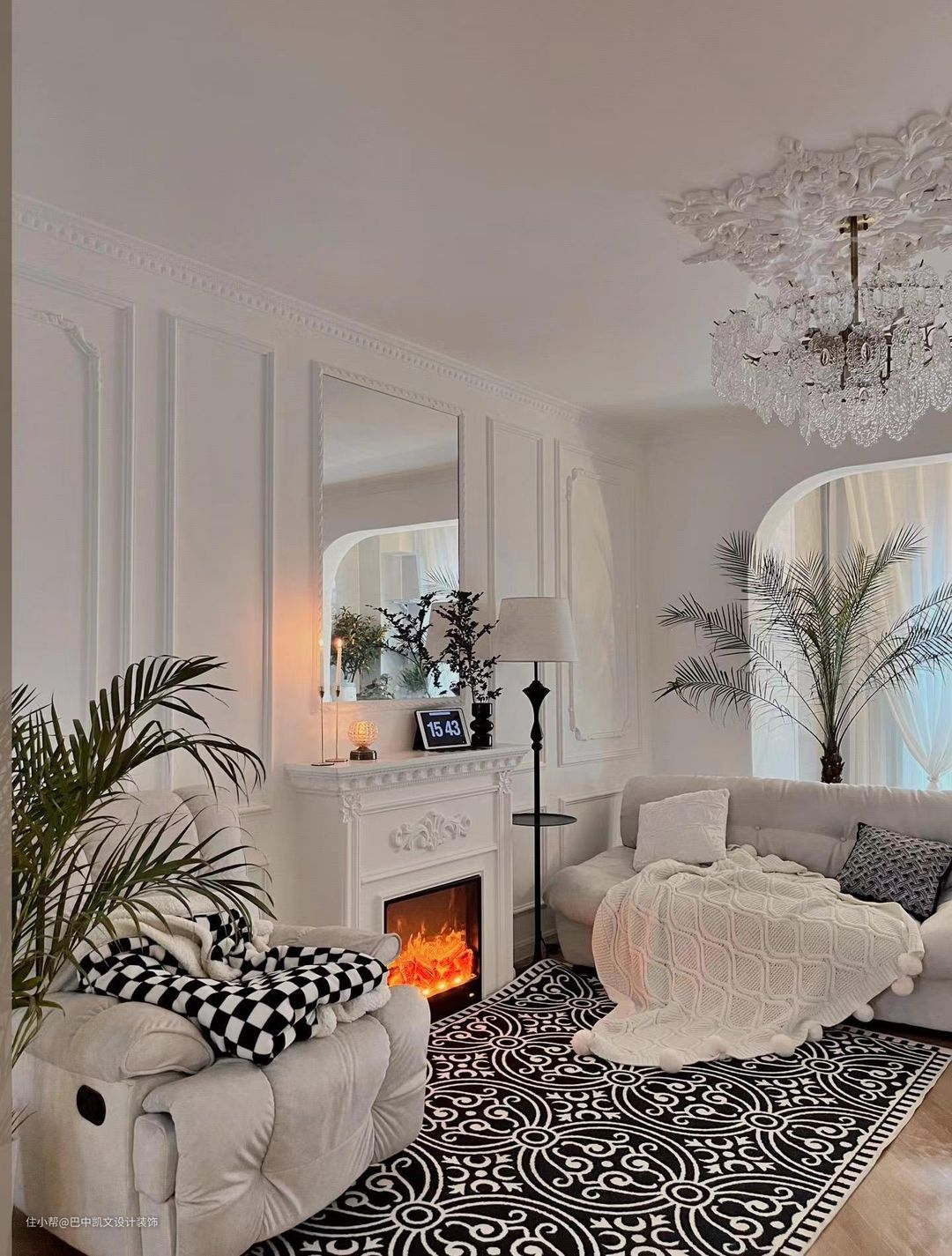 客厅吊顶材质用的法式浮雕造型,背景墙采用壁炉增加房子的氛围感