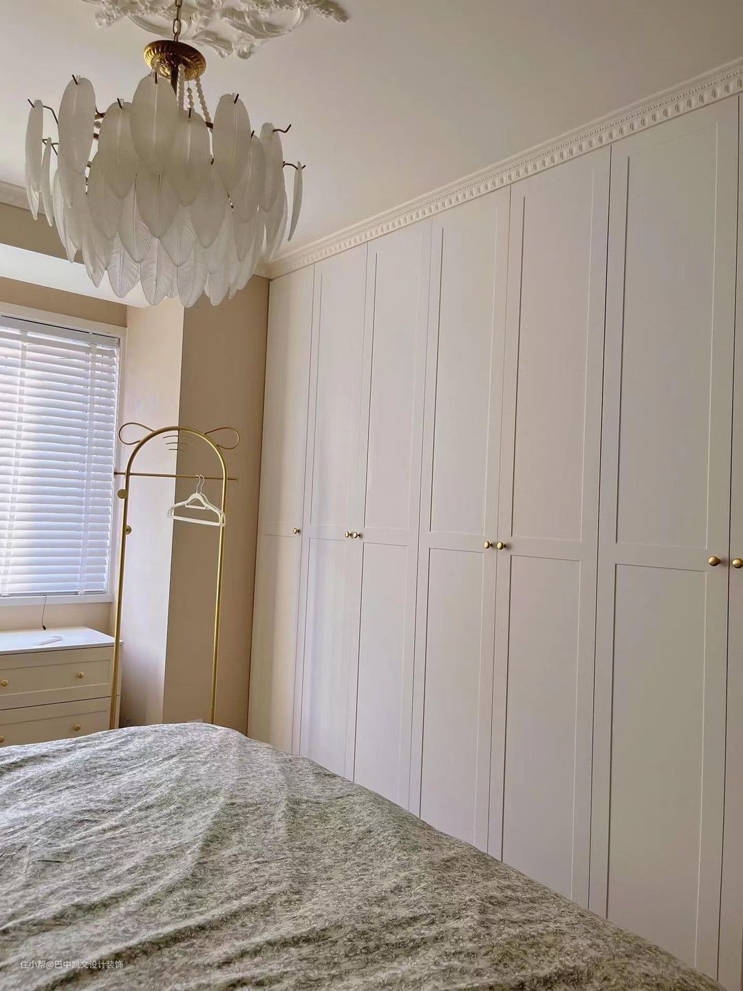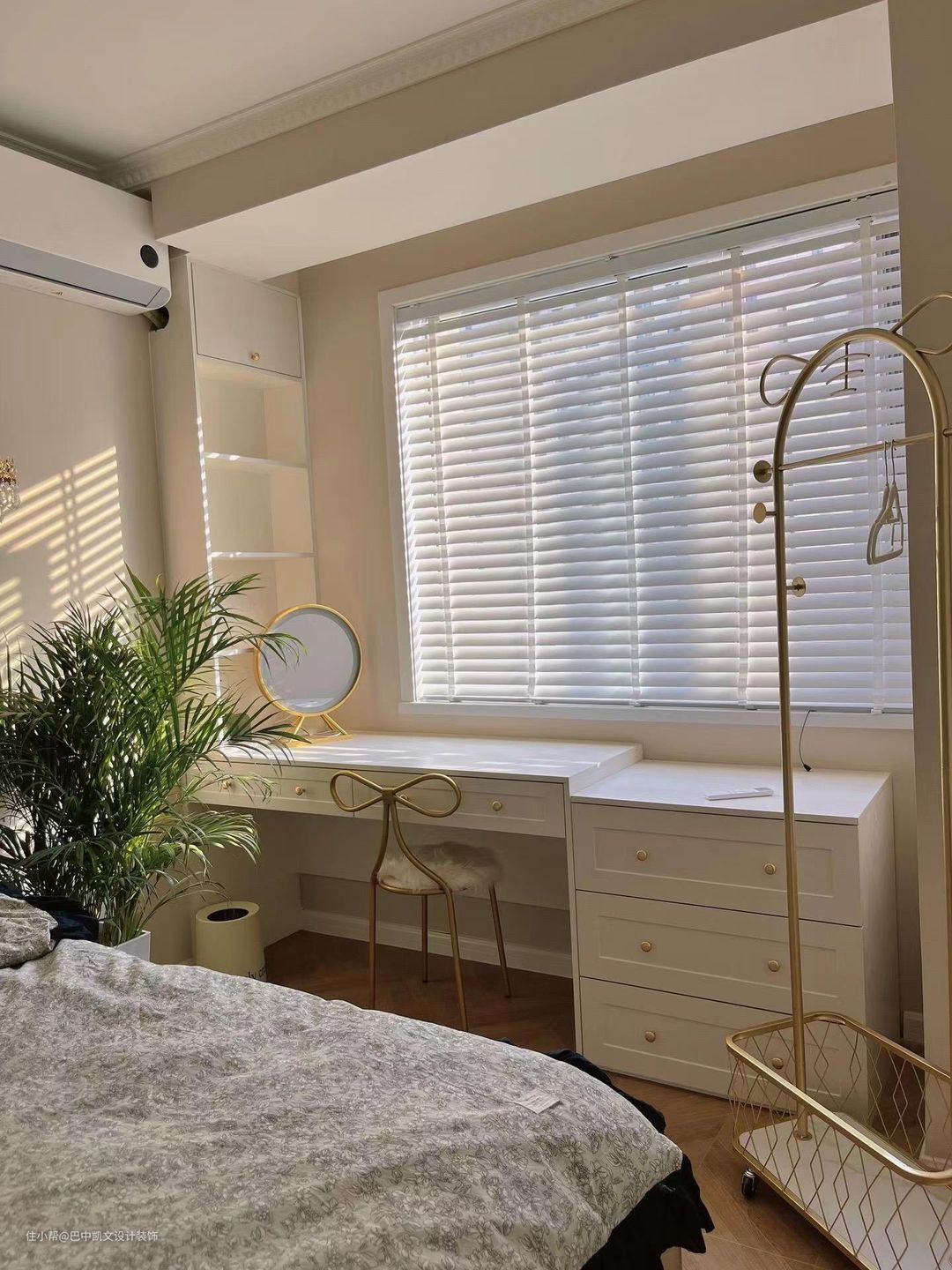 利用飘窗位置坐了一个梳妆台,衣柜放在床尾,增加了收纳空间