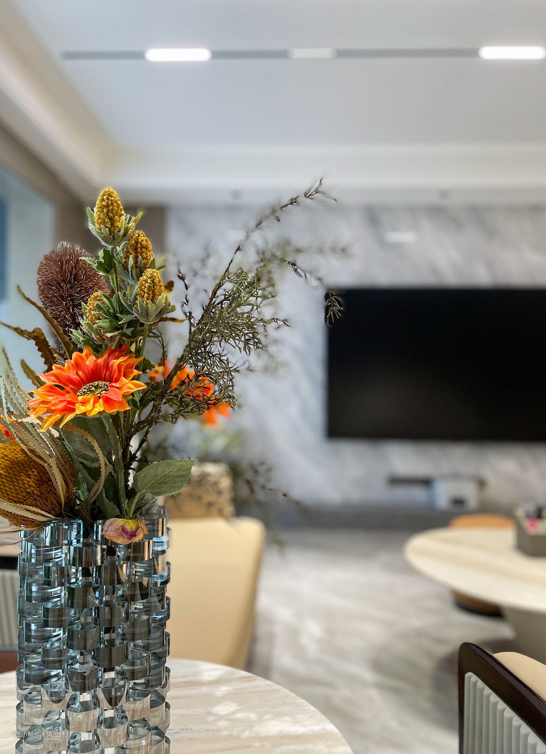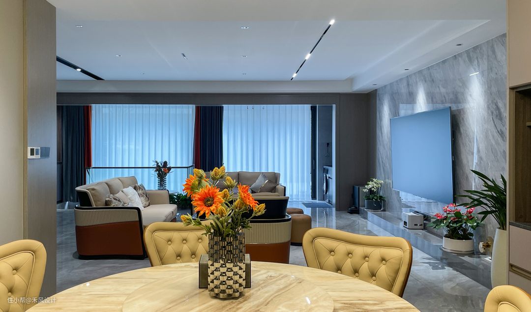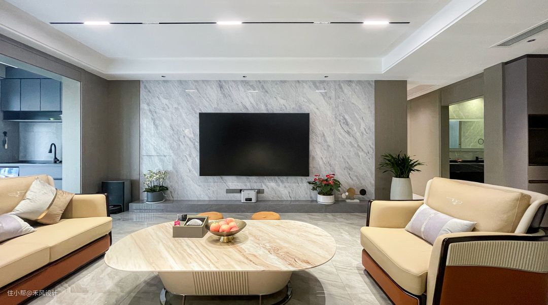 1、沙发背景墙定制满墙柜,增加玻璃柜门,内装嵌入式暖色系灯带超高级~ 2、因为本案属于复式,原本一楼的层高相比较于原始户型层高来看,会比较低,所以选择无主灯设计超显层高。 3、打通客厅和阳台,将阳台纳入客厅,增加客厅的使用面积。 4、双眼皮吊顶,壁挂电视机更简约。