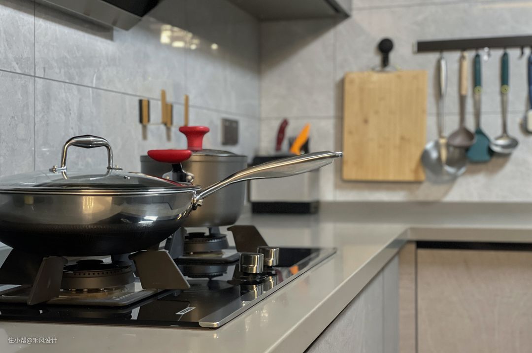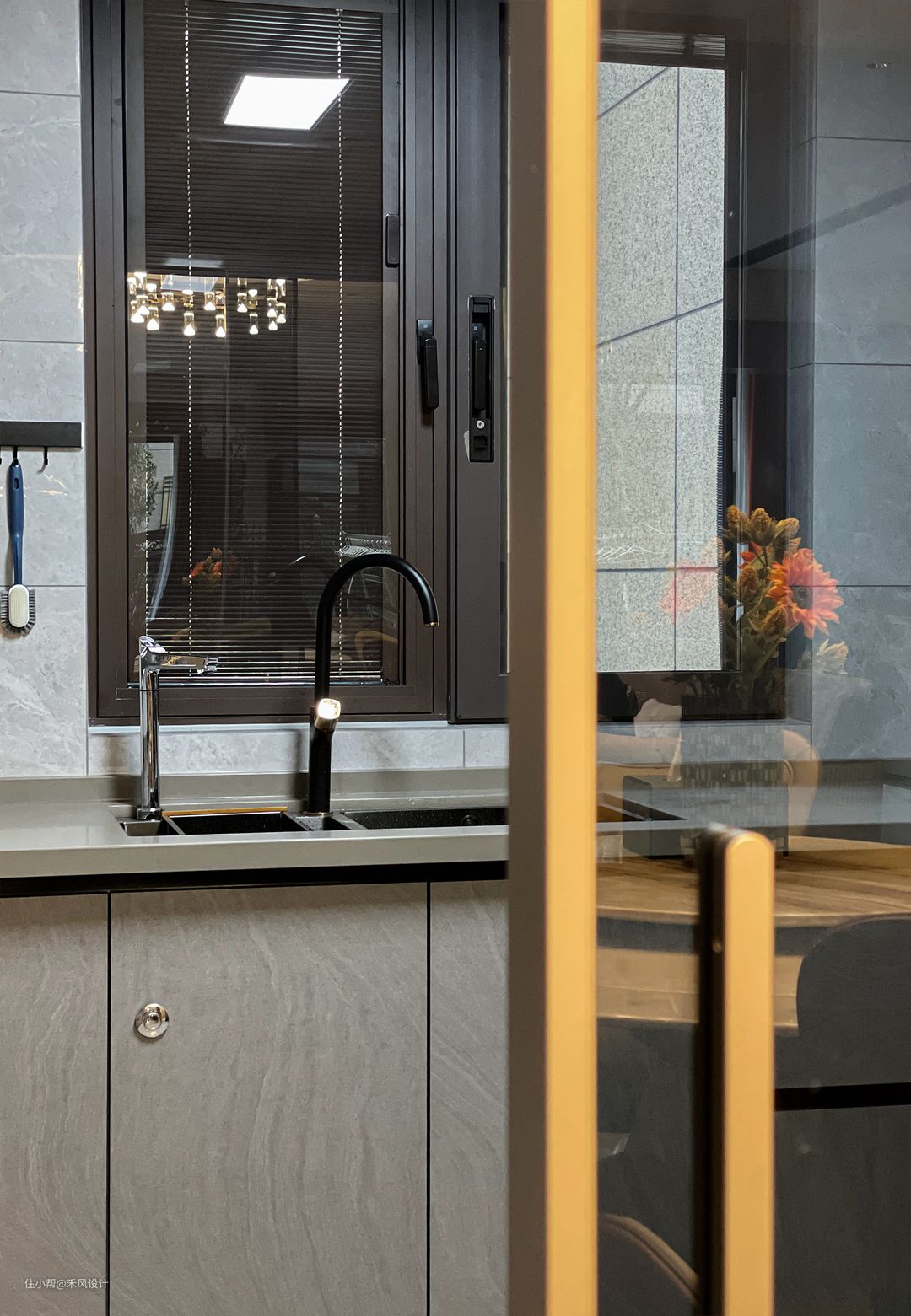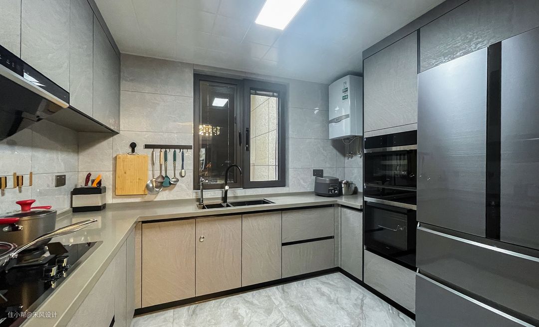 1、U型厨房设计,符合洗—切—炒基本动线,增加吊柜+地柜,满足超强收纳空间。 2、定制通顶式储物柜,将部分家电嵌入到柜体中,而且冰箱也能有地方放。