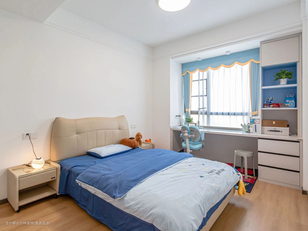 在可爱温柔的女孩房中,采用组合猫猫元素的床头,纯色背景墙玩偶收纳装饰,以及台灯也点缀着的有趣向往,均为空间注入了简约舒适,又充满少女浪漫的情结氛围。男孩房延续了相同的空间布局,窗户在细节的转变中加入书桌的设定,让男孩房也多了一个学习娱乐的场所。浅淡的卧室中加入蓝色的装饰,抱枕、椅子、窗帘与床品,细节的展现也为休息空间营造出清新而惬意的氛围。
