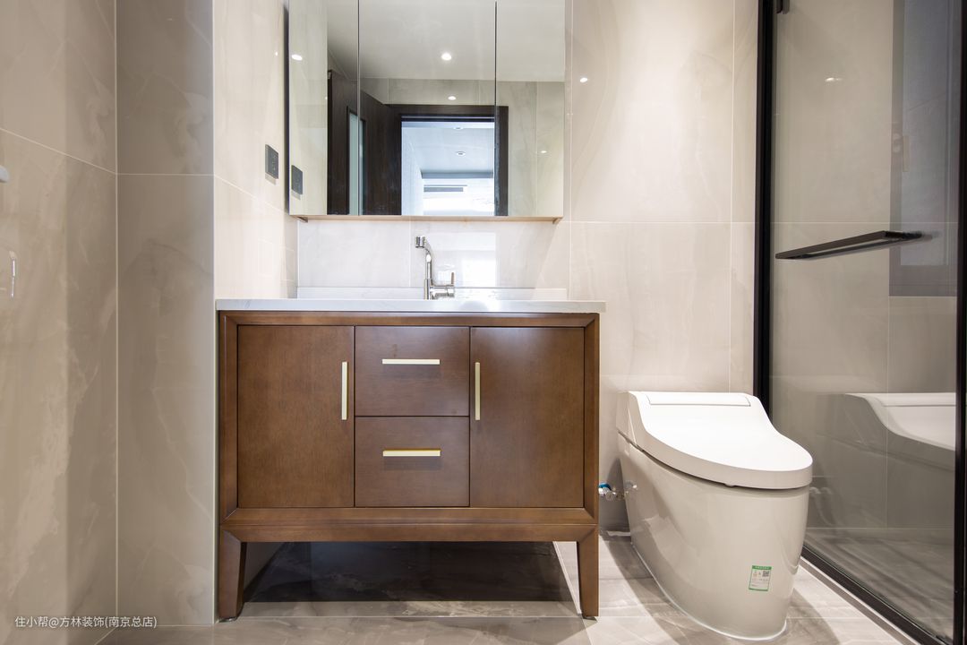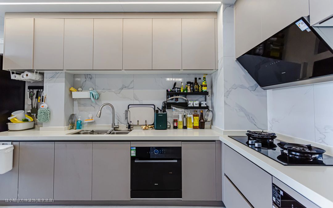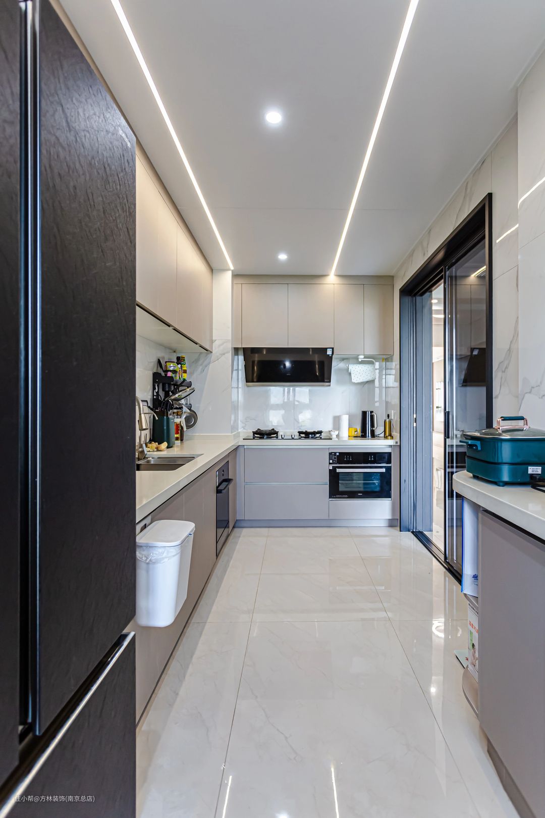 在餐厅的后方就是就是厨房空间,L型布局的橱柜,冰箱摆放在了厨房的一侧,以灰色地砖搭配白色墙砖和木质橱柜,整体显得很有轻奢感。现代化的厨房,整洁干净。厨房有烟火,身旁有家人,心里有爱,这是生活平凡而美好的模样~