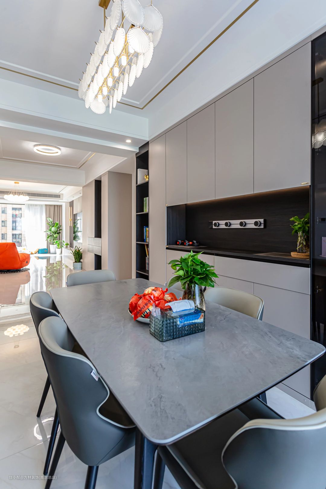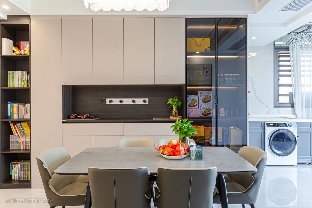 一体式的客餐厅结构,可以让光线和空气相互流通,设计风格和色调与客厅形成统一,线条简约的餐桌,皮质餐椅,将时尚与优雅相融合,让每一餐都充满仪式感。客餐厨不设限的设计之下,空间的流通感让家人之间的交流更加亲密,期间绿色的延续与点缀,也让生活变得轻松又充满想象与未知。
