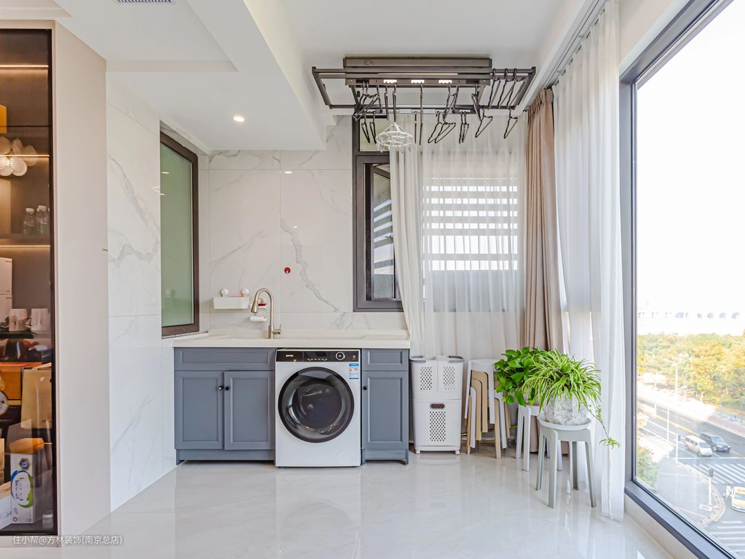 阳台一侧设计了洗衣区,晾晒更方便,还能节省卫生间的空间~角落里放置的绿植让整个空间更有活力~业主喜欢在阳台晒太阳,就在阳台放置了一个米白色的懒人沙发,搭配紫色花花抱枕,更是亮眼~
