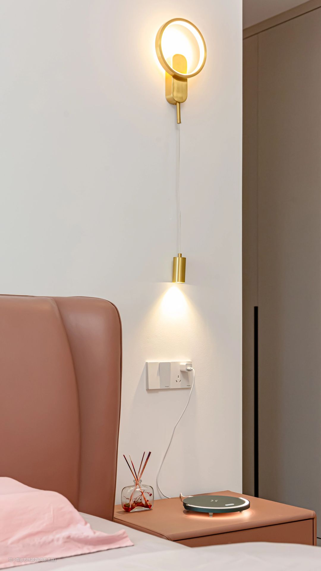 主卧淡雅的色调、极简的线条,营造舒适的视觉效果。带有粉色的软包面料与中性色木质的碰撞,演绎都市时尚魅力,属于夜晚的美好,在这里开始。