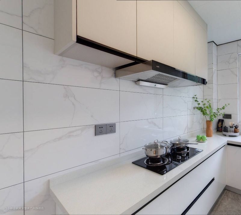 整排的白色收纳柜与吊柜为一体,加上厨房四周墙面通铺光滑的瓷砖,让厨房更加协调统一。L型的空间动线,让厨房洗切炒动线更加流畅,嵌入式的抽油烟机,节省了不少的厨房空间,还为厨房油烟排除预留了充足的空。