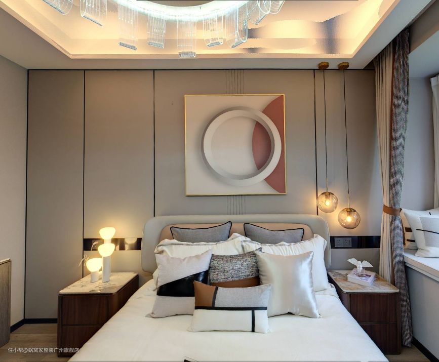 来到主卧,首先映入眼帘的是一张舒适的大床;米色的卧室背景墙搭配有条不紊的装饰线条,不喧宾夺主又让空间质感一览无余!