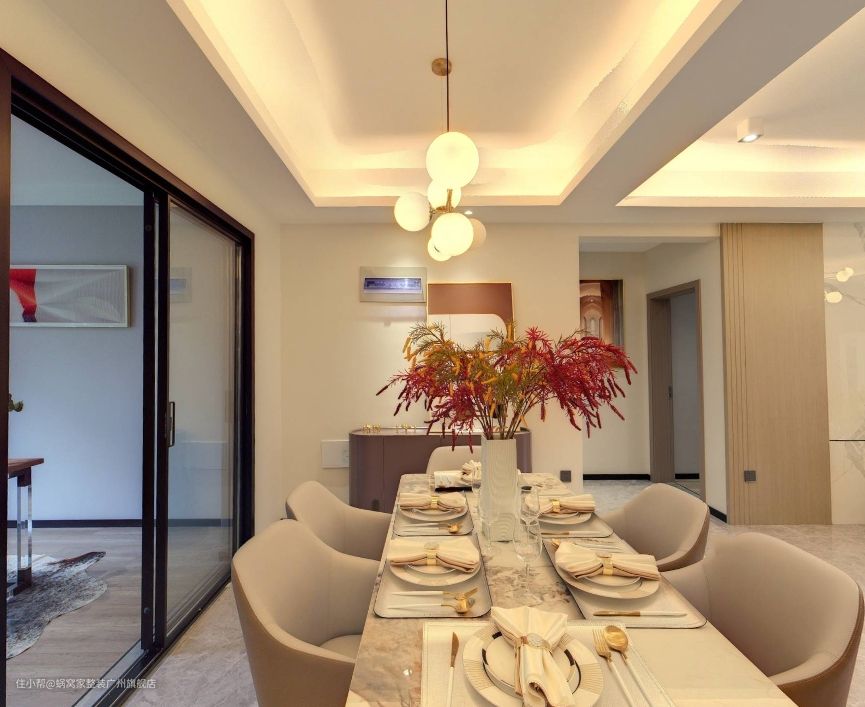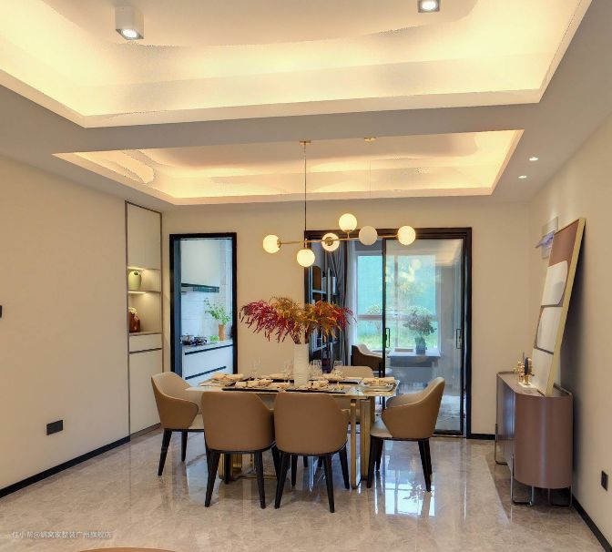餐厅空间宽敞加上双眼皮奥吊顶抬高我们的视觉空间,餐厅整体更显敞亮。跳色六人餐桌椅摆放整齐,恰好供一家人日常用餐以及待客需求,加上主灯的点缀,给家人一种星级用餐体验。