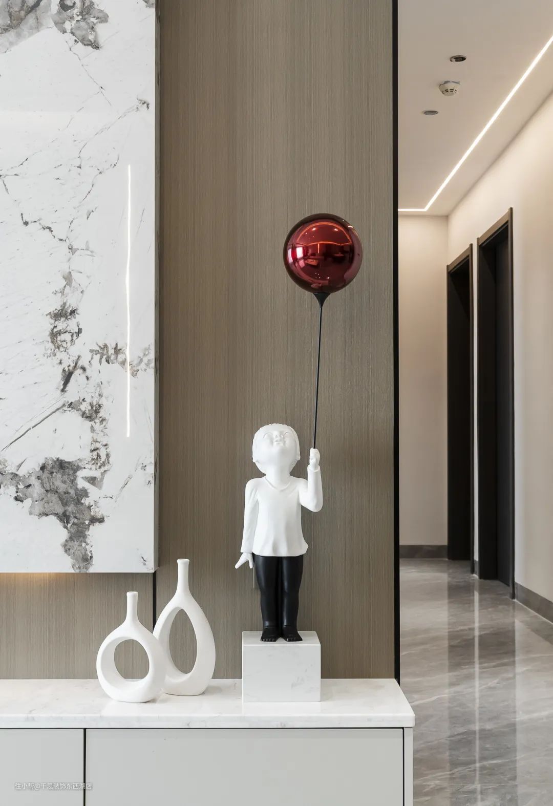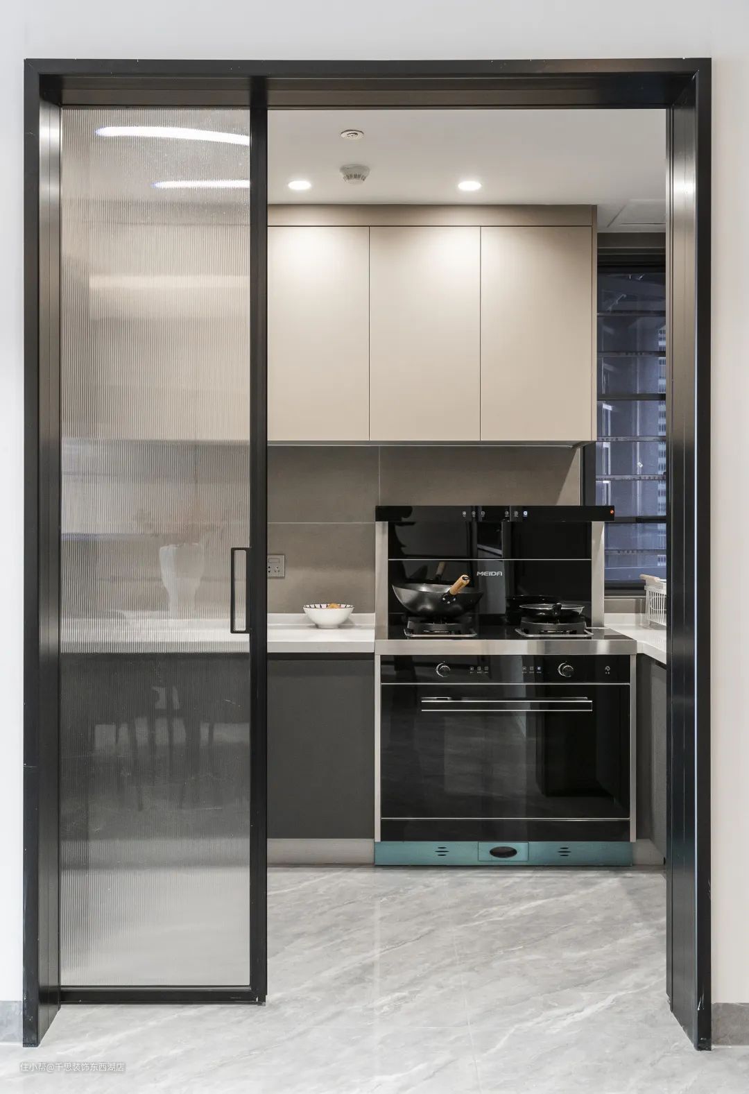 餐厨之间设长虹玻璃吊轨推拉门,地面无阻隔。过道区域,亦做无主灯照明,以筒灯+线性灯带照明。整个公区空间年轻又具时尚感。相比地轨推拉门,吊柜推拉门设计更隐形,轨道和门放进墙内,能完美隐藏起来,极简的造型不失优雅,同时也可避免轨道藏灰。