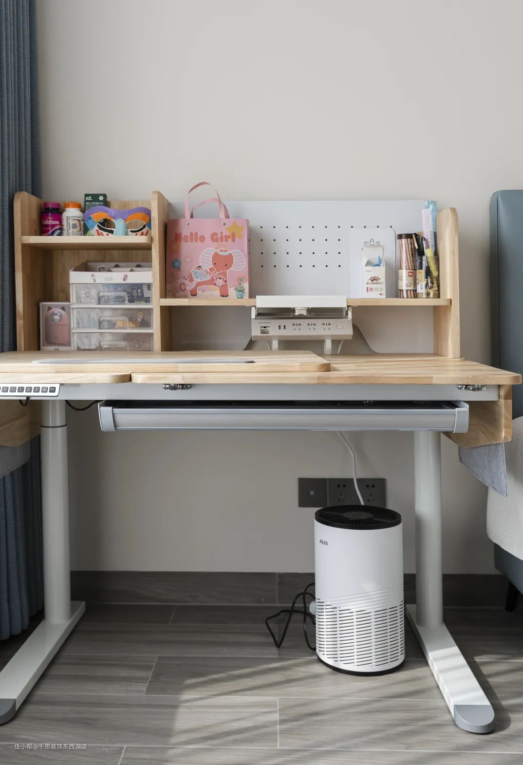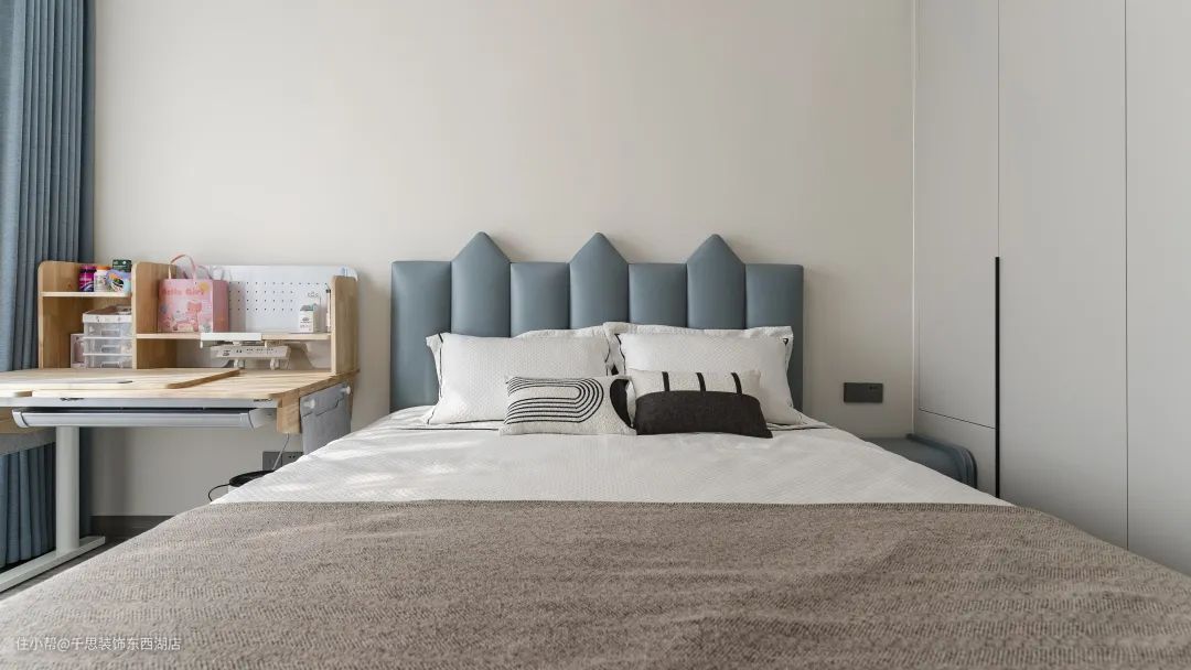 儿童房的布局,虽简洁却实用,以灰蓝奠定空间基调,略带清新的俏皮。以木质书桌取代床头柜的设计,将有限的空间最大化使用。