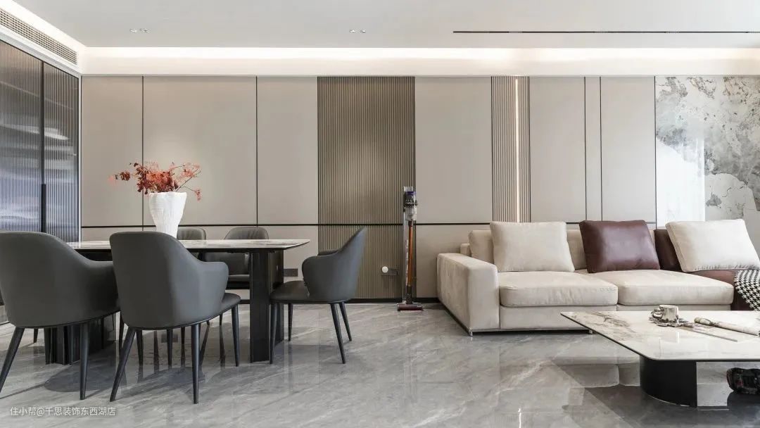 客餐厅开放式设计,并无明显界限。整面背景墙以木饰面+格栅+岩板组合,嵌入黑色钛形条与线灯装饰,流露出高级大气的气质。