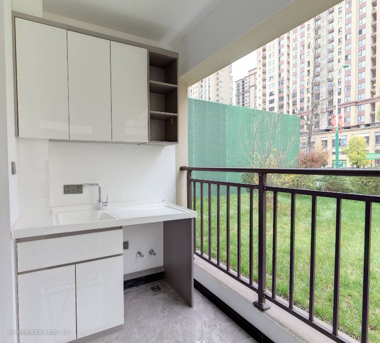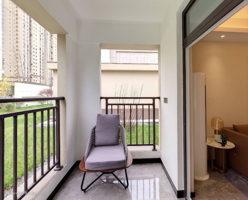 阳台视觉空间开阔,一端是白色的收纳柜,半封闭式+半开放式的收纳柜,收纳空间更大;另一端放置了一张休闲椅,为业主打造一个休闲区。