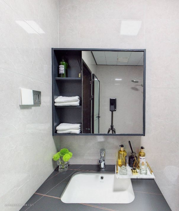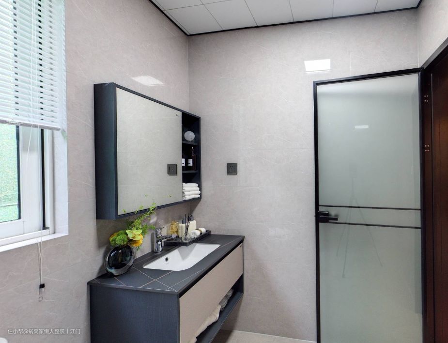 卫生间跟主卫风格高度相似,但却各有各的特点,卫生间半开放式半封闭式的收纳镜柜,更方便业主的收纳需求。