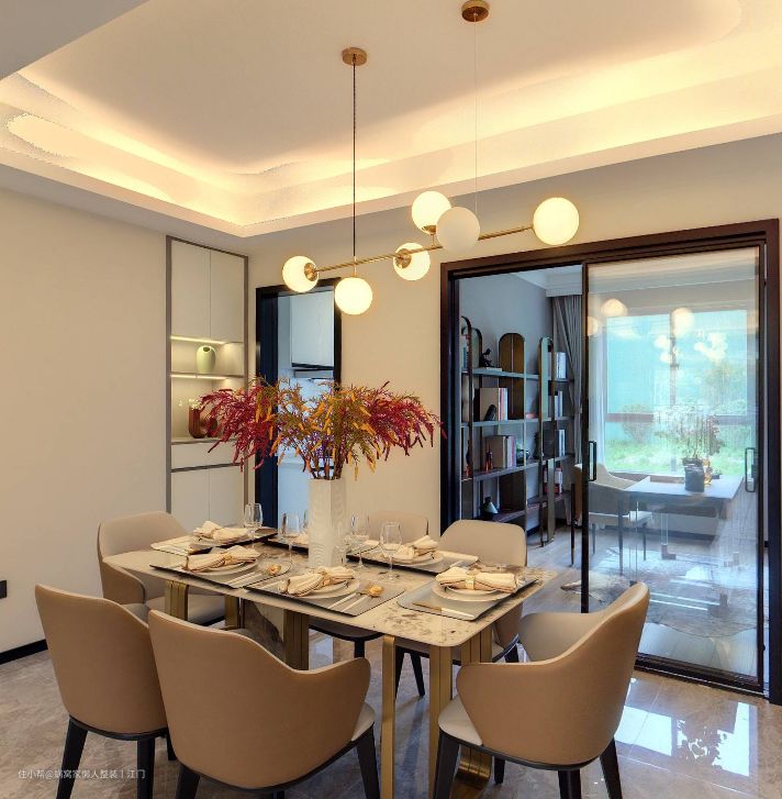 餐厅空间宽敞加上双眼皮奥吊顶抬高我们的视觉空间,餐厅整体更显敞亮。跳色六人餐桌椅摆放整齐,恰好供一家人日常用餐以及待客需求,加上主灯的点缀,给家人一种星级用餐体验。
