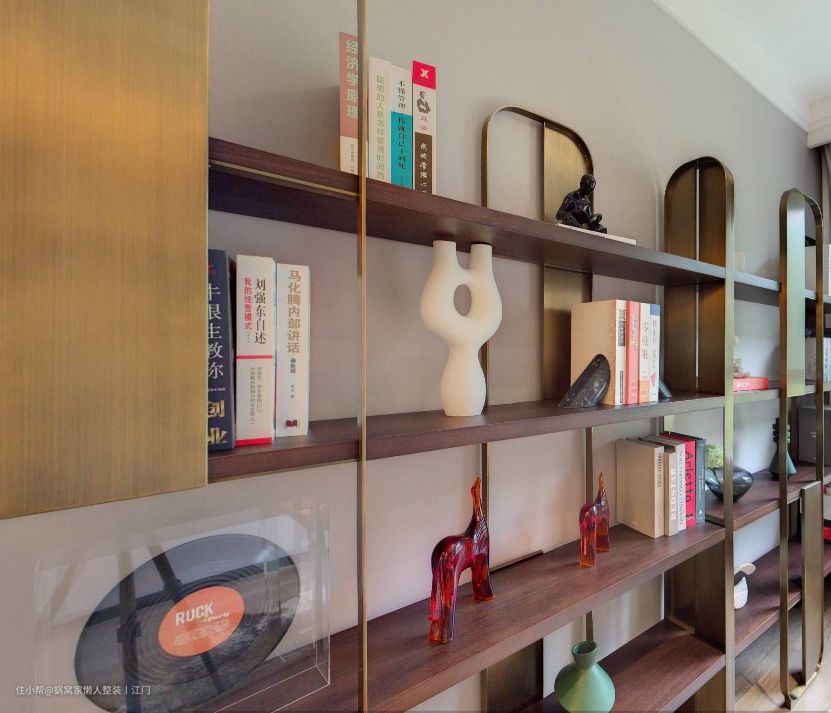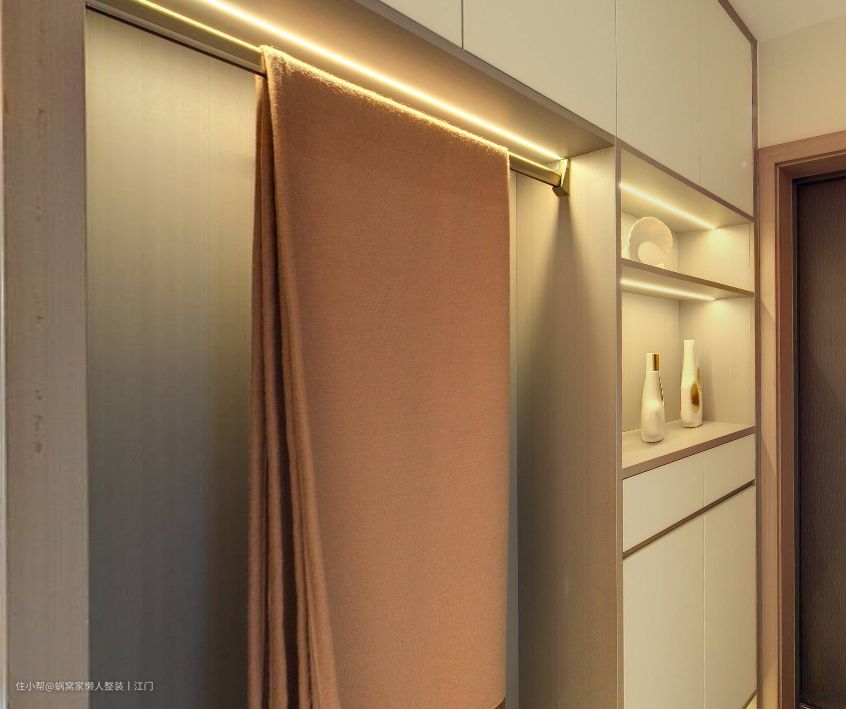玄关柜留空设计,便于业主对的置物需求,柜内部嵌入的LED灯带,让晚上找东西更显清晰易见,还能烘托玄关的氛围感。